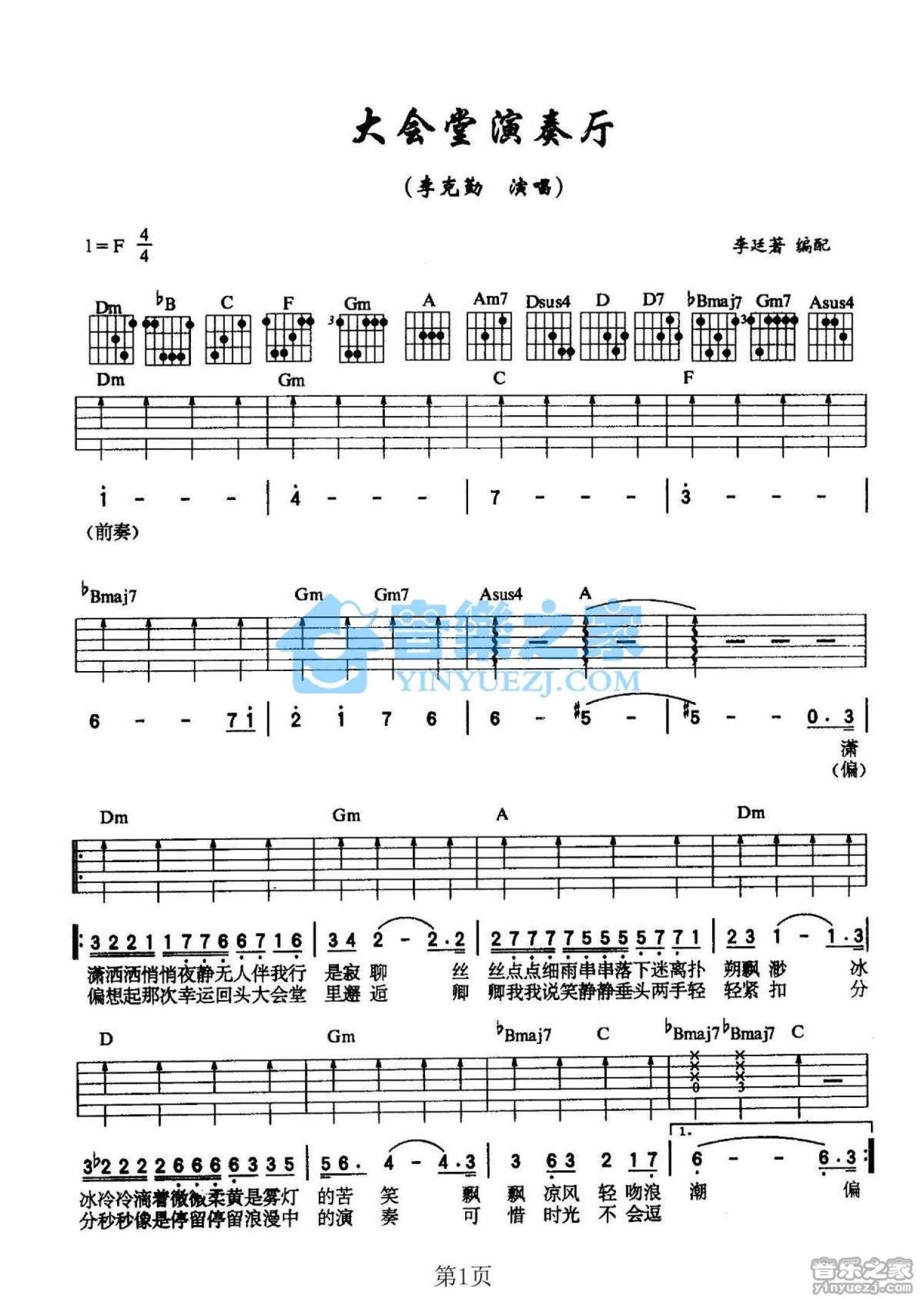 曲谱介绍: F调版李克勤《大会堂演奏厅》吉他弹唱六线谱