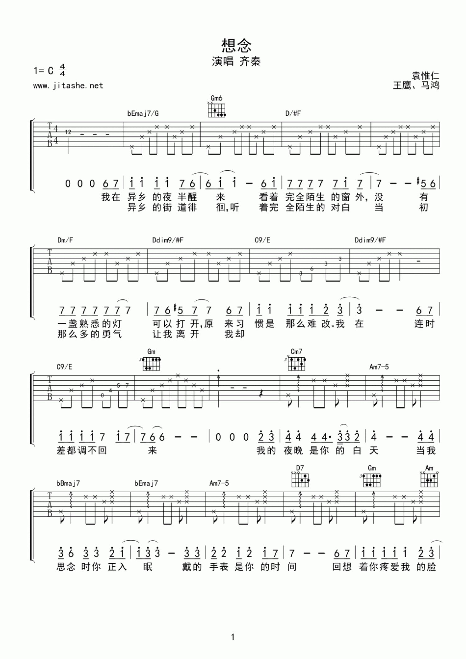 想念吉他谱 - 齐秦 - 吉他弹唱谱