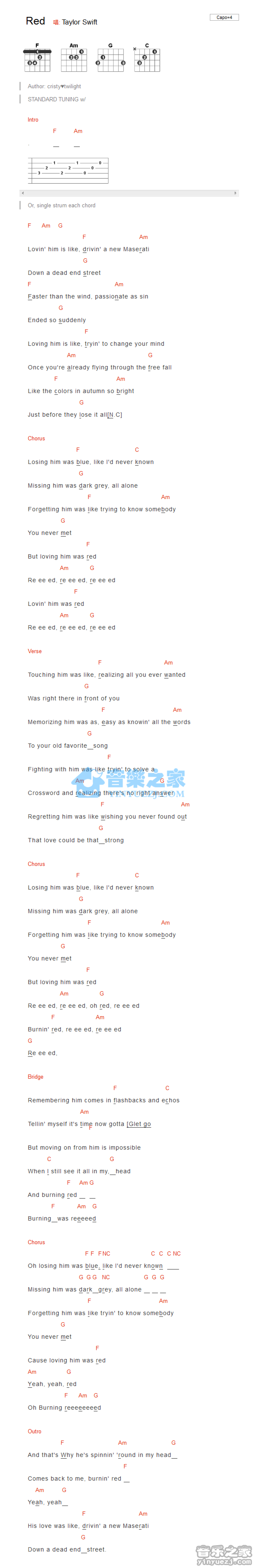 曲谱介绍: TaylorSwift《Red》吉他和弦弹唱谱