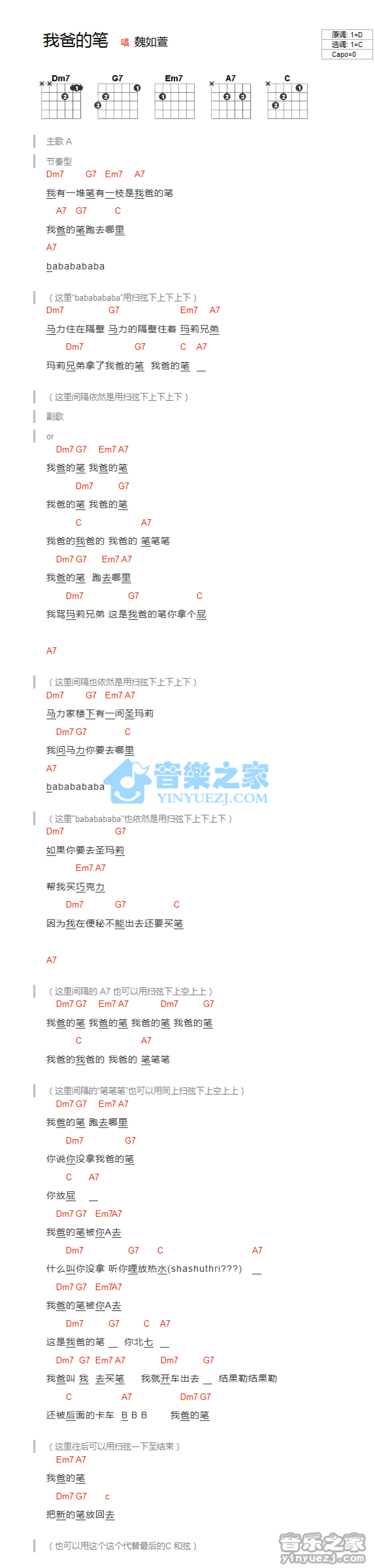 曲谱介绍: C调版魏如萱《我爸的笔》吉他和弦弹唱谱