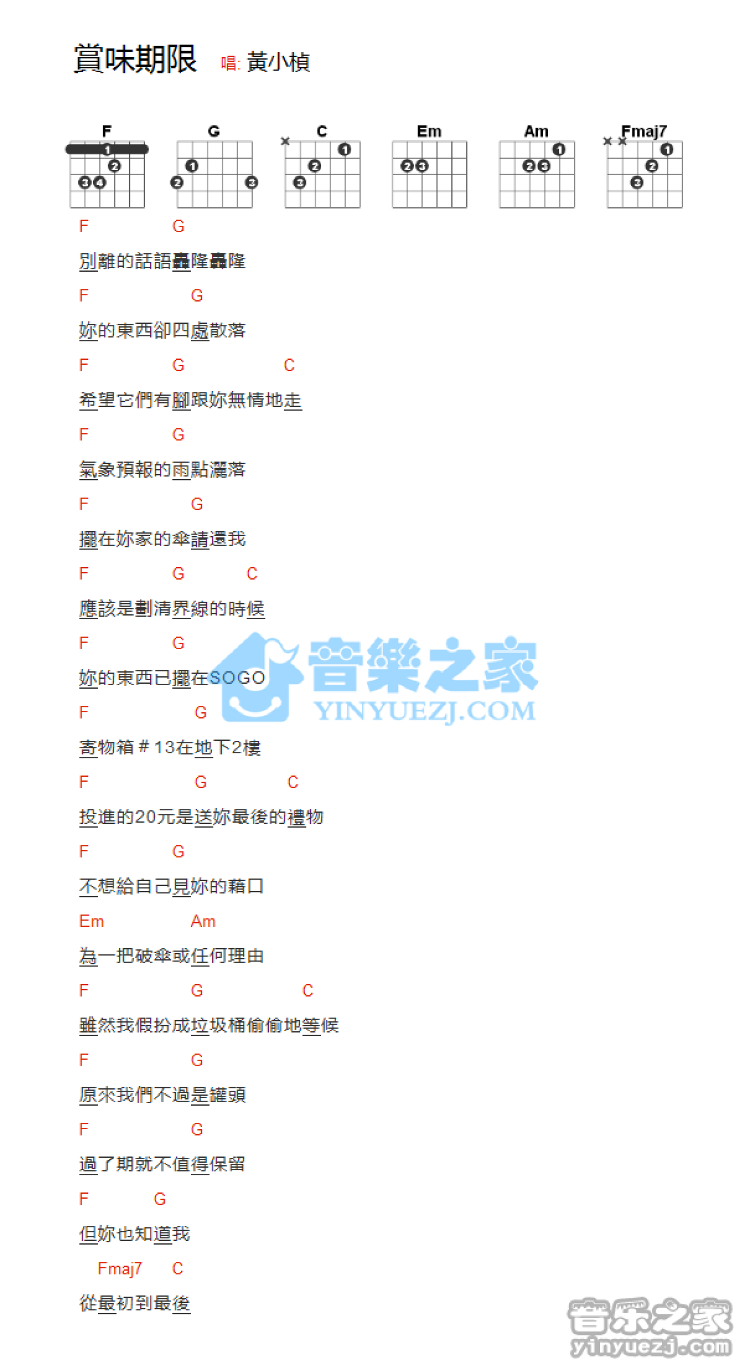 赏味期限吉他谱 - 黄小桢 - F调吉他弹唱谱 - 和弦谱