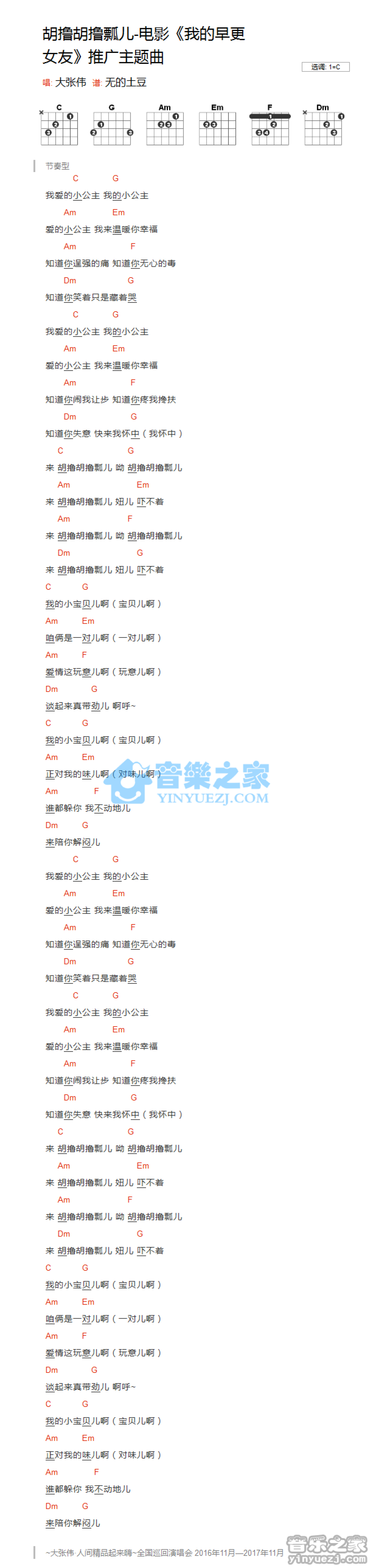 曲谱介绍: C调版大张伟《胡撸胡撸瓢儿》吉他和弦弹唱谱