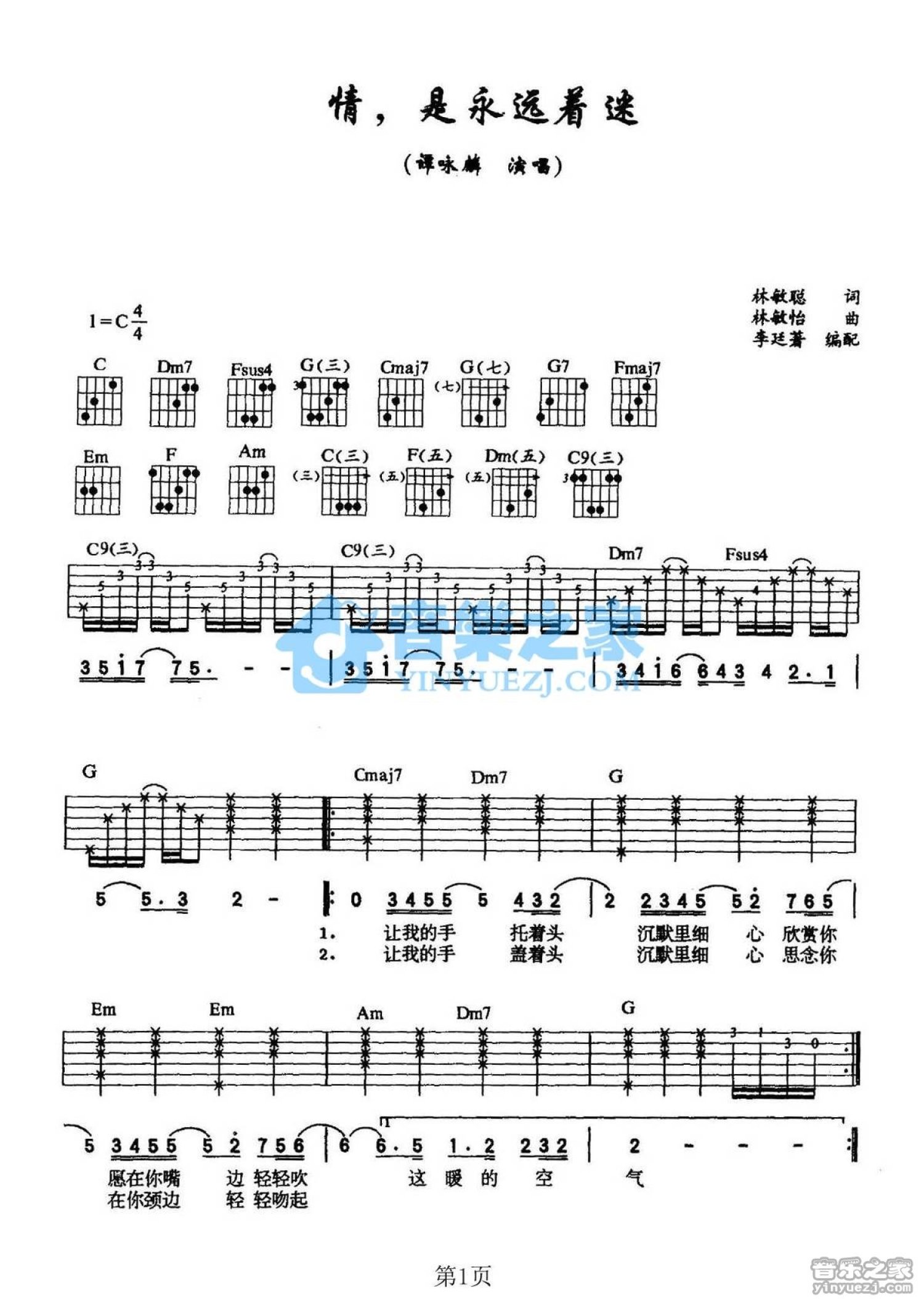 曲谱介绍: C调版谭咏麟《情是永远着迷》吉他弹唱六线谱