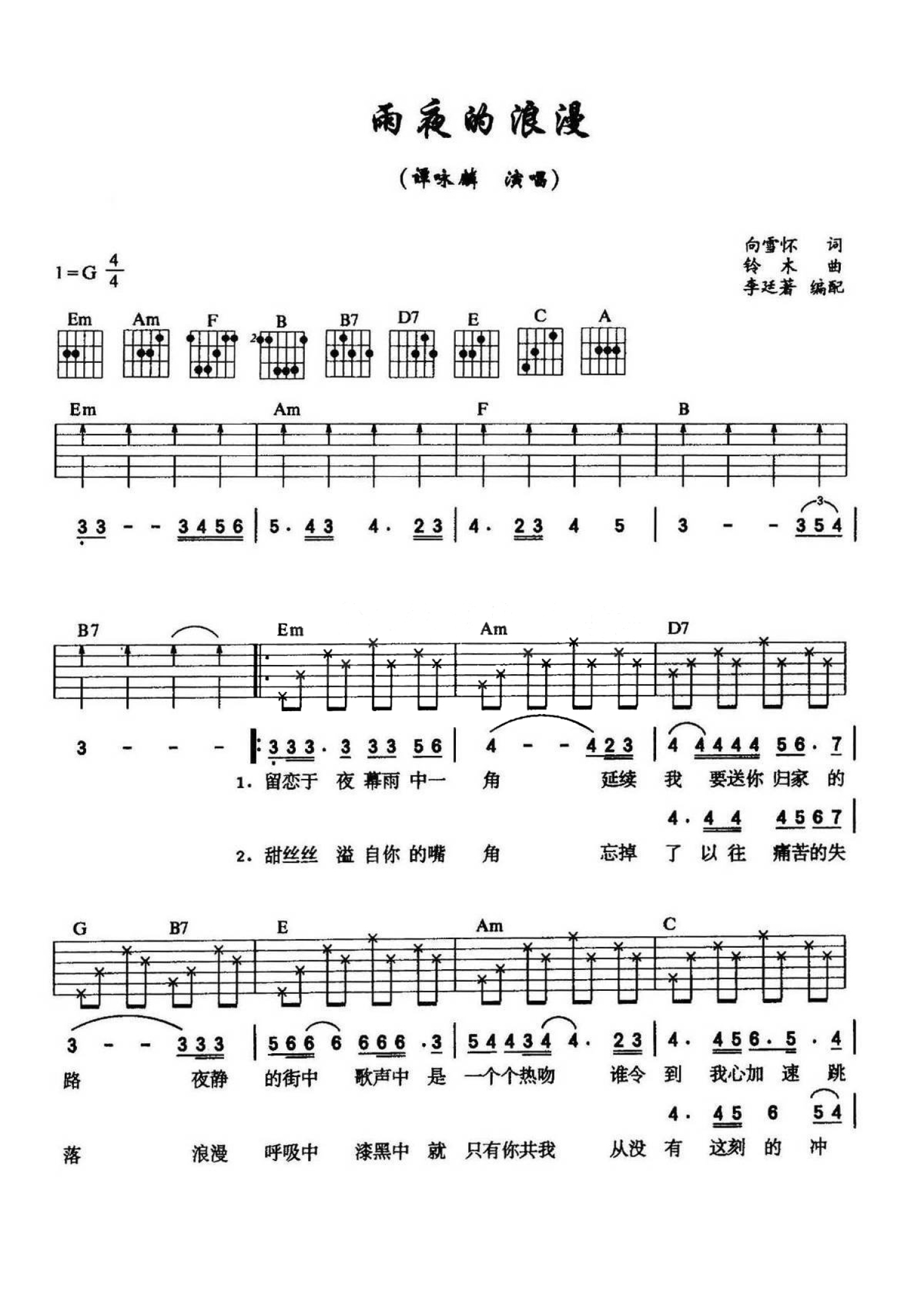 曲谱介绍: G调版谭咏麟《雨夜的浪漫》吉他弹唱六线谱