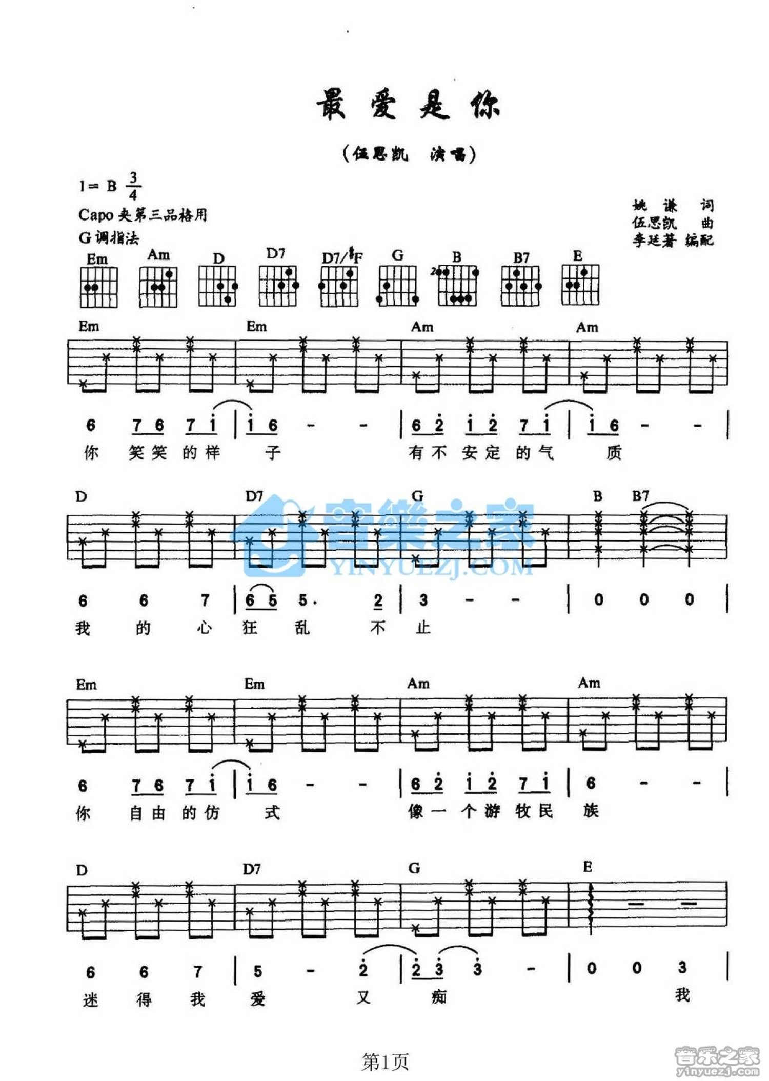 曲谱介绍: G调版伍思凯《最爱是你》吉他弹唱六线谱