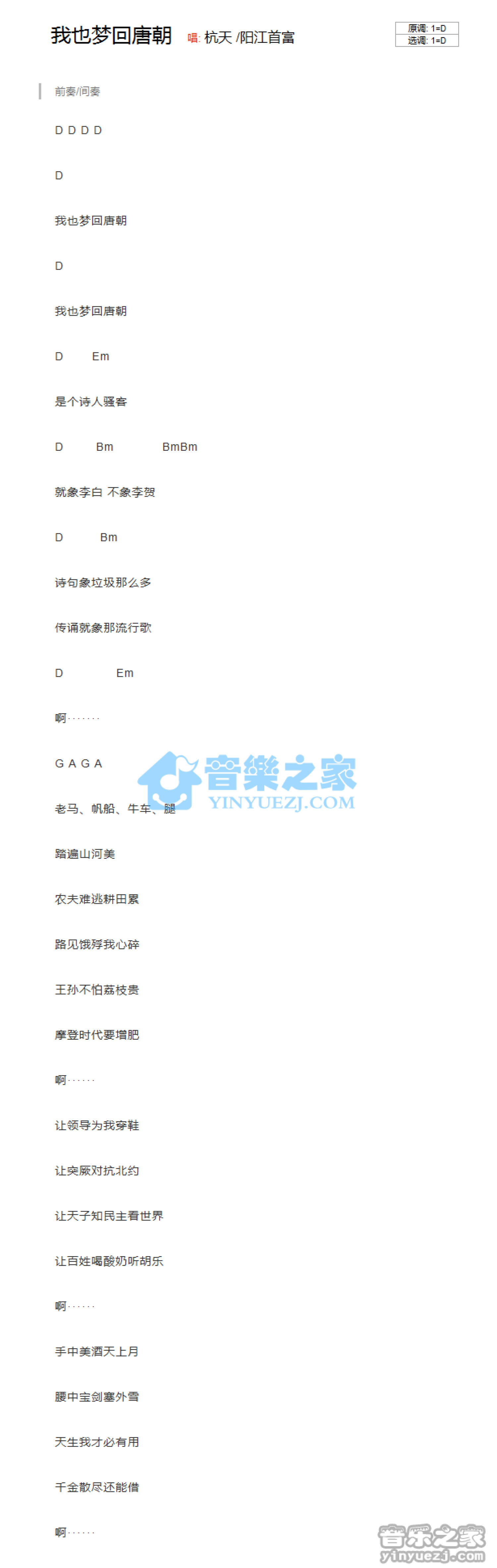 曲谱介绍: D调版杭天《我也梦回唐朝》吉他和弦弹唱谱
