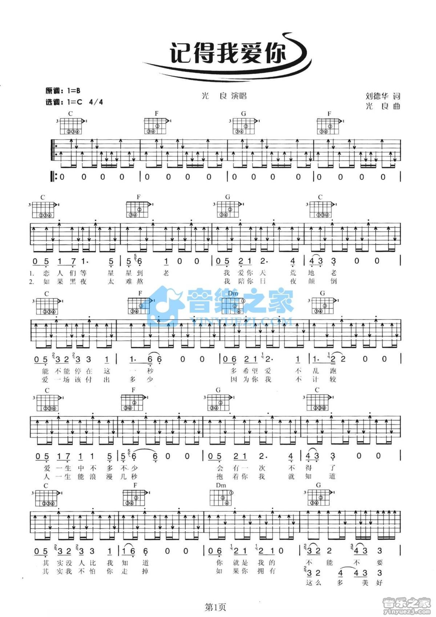 曲谱介绍: C调版光良《记得我爱你》吉他弹唱六线谱