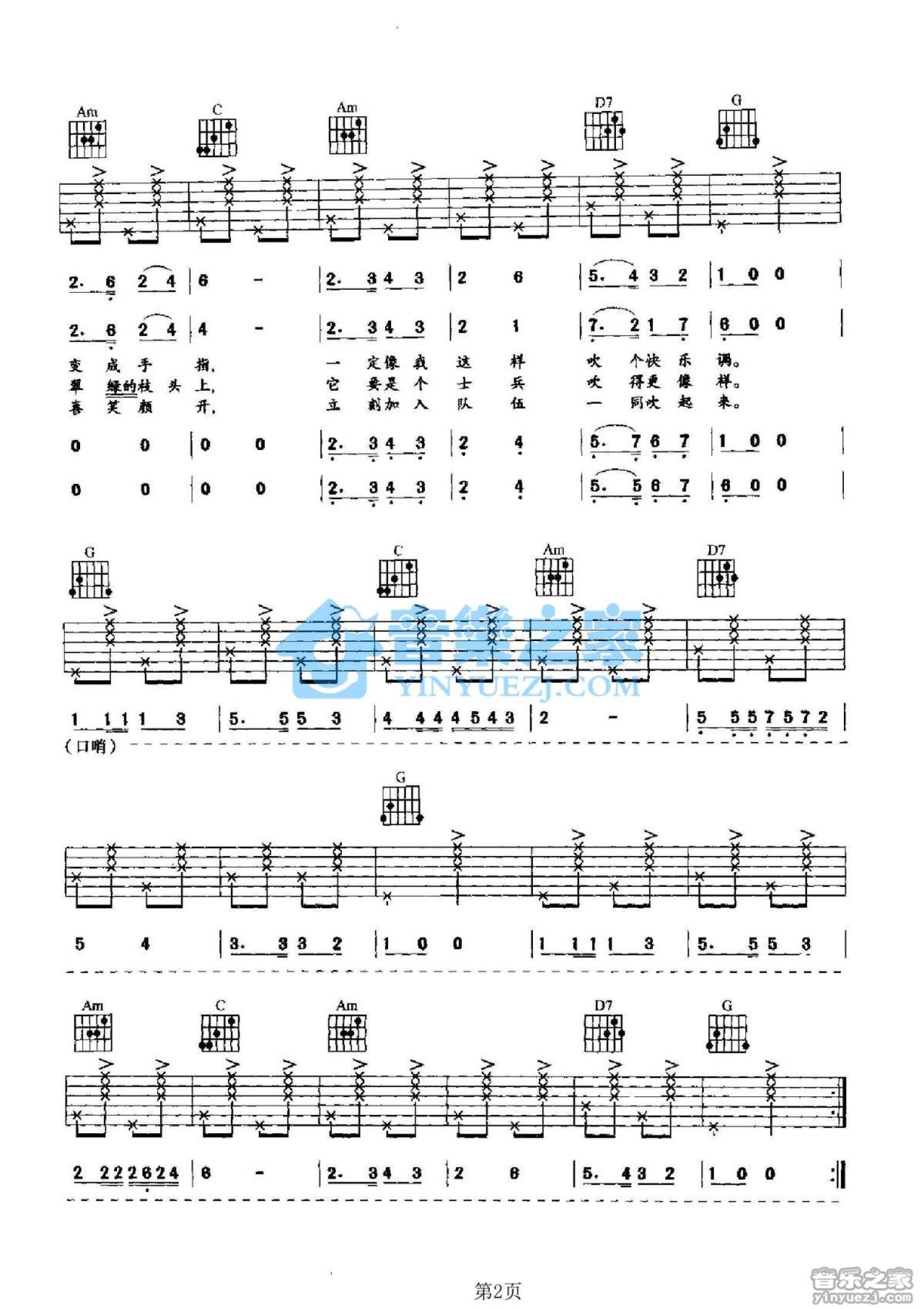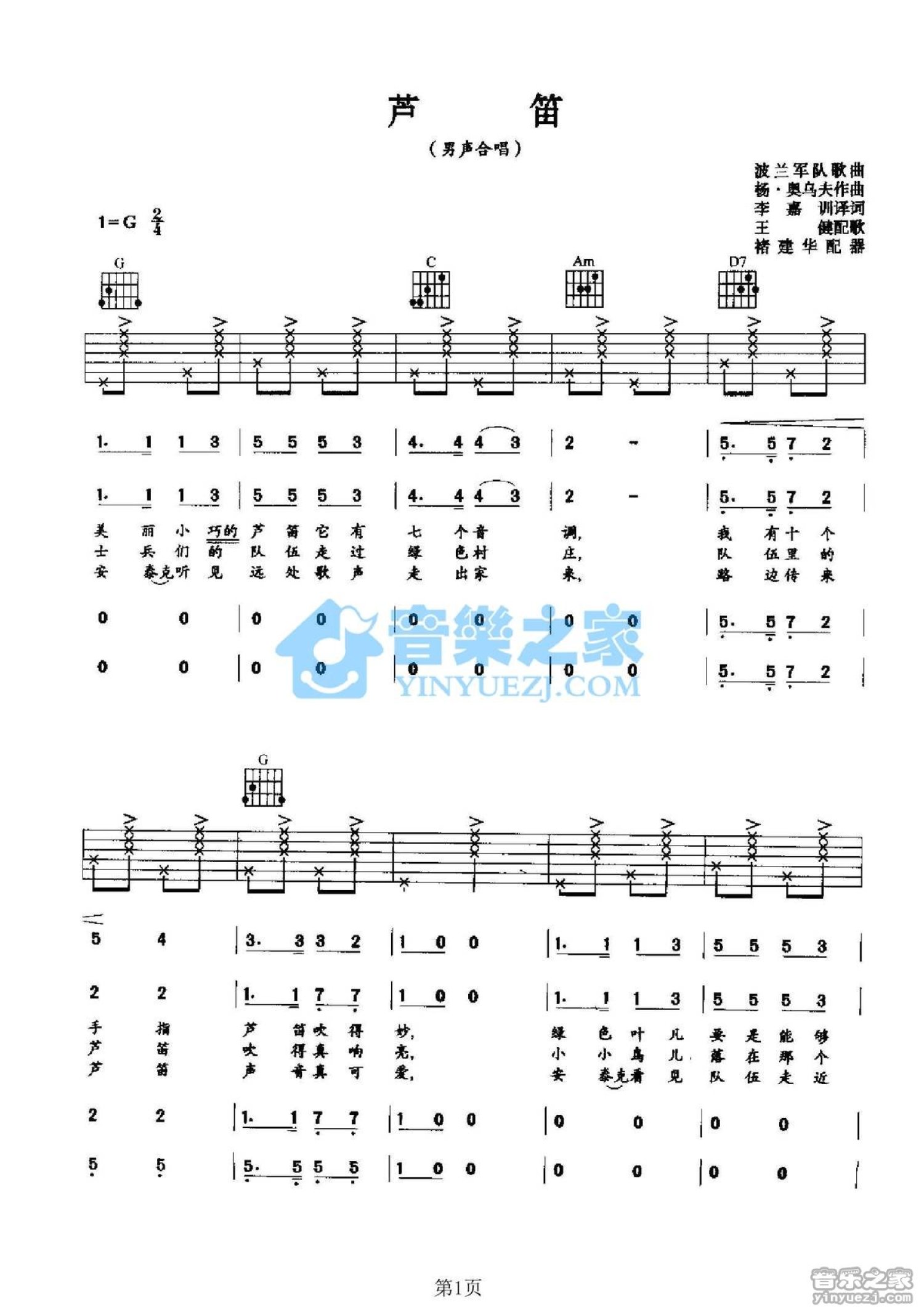 曲谱介绍: G调版波兰歌曲《芦笛》吉他弹唱六线谱