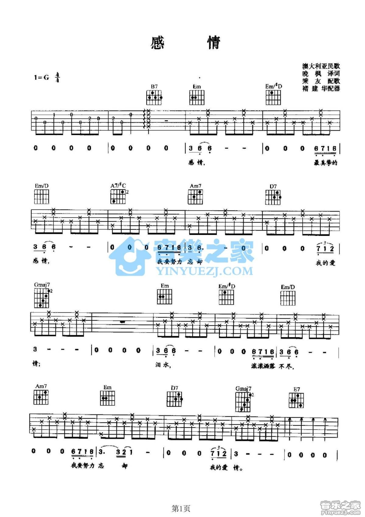 曲谱介绍: G调版澳大利亚民歌《感情》吉他弹唱六线谱