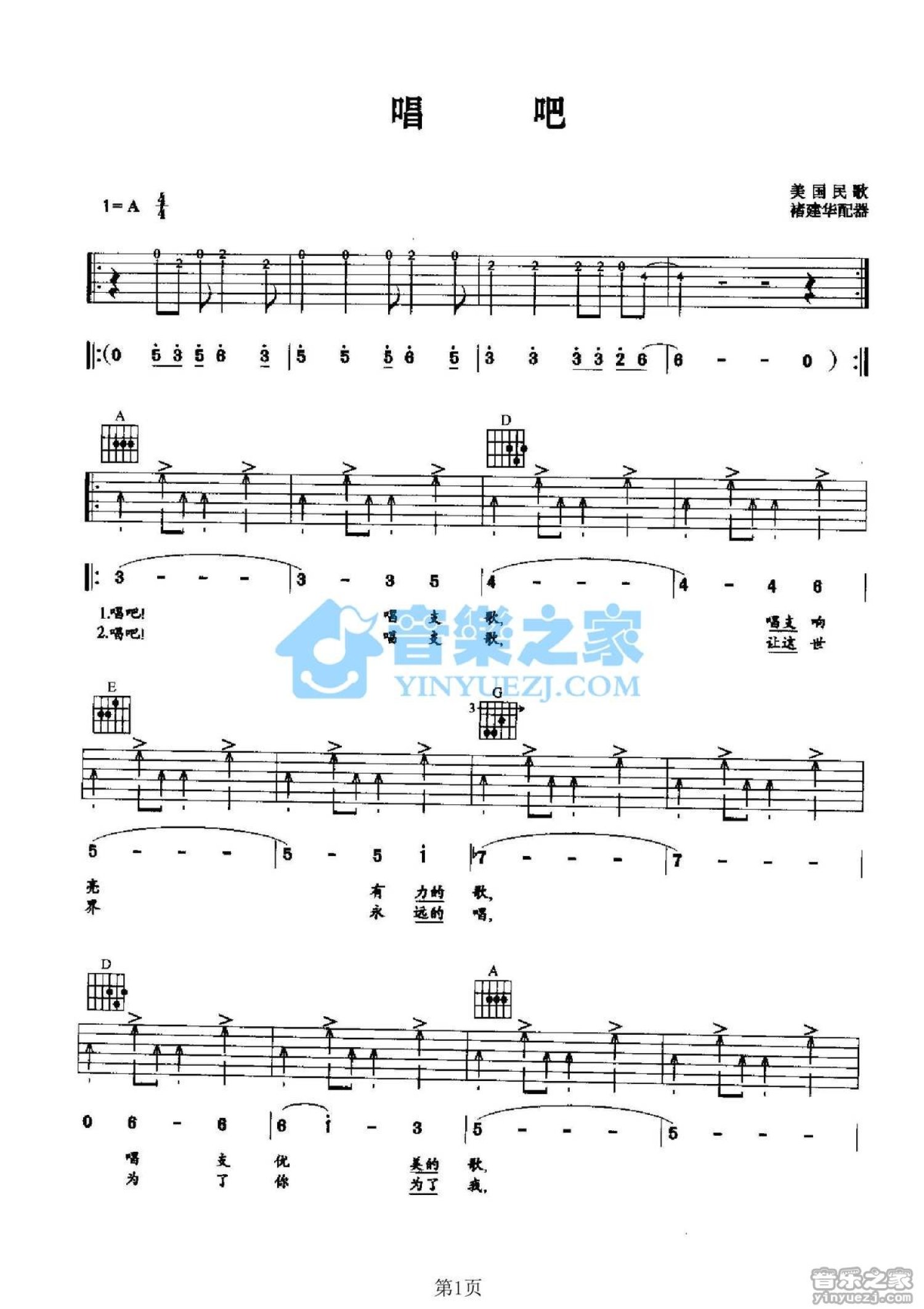 曲谱介绍: A调版美国民歌《唱吧》吉他弹唱六线谱