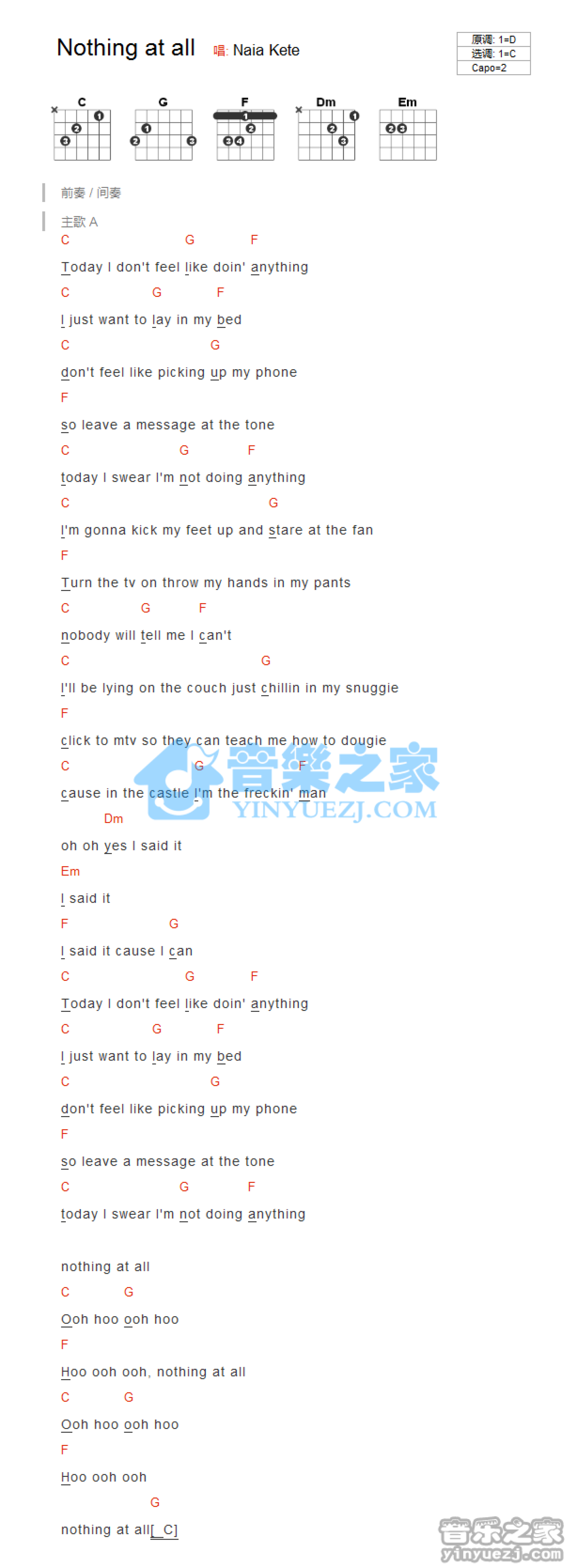 曲谱介绍: C调版NaiaKete《NothingAtAll》吉他和弦弹唱谱