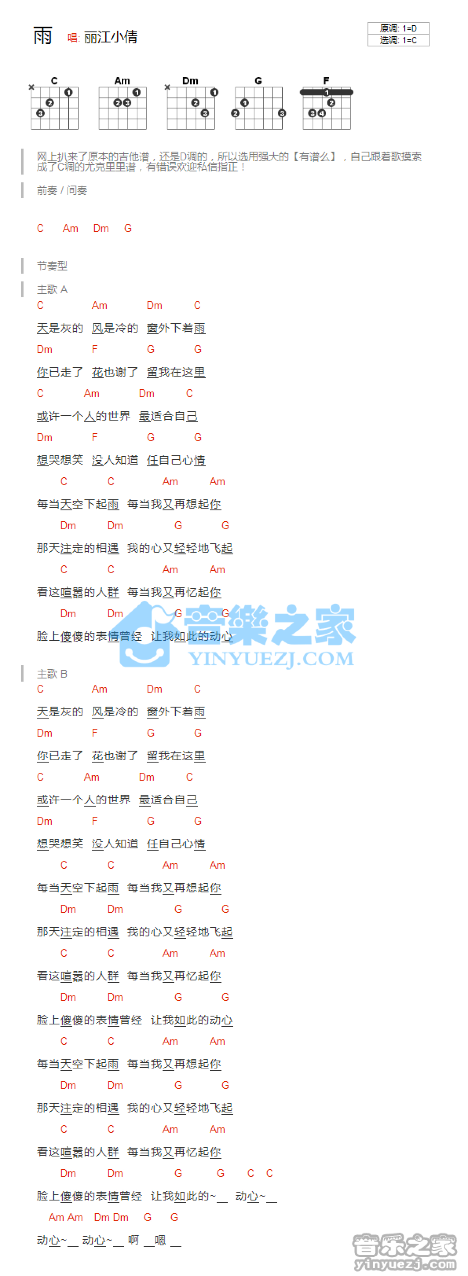 曲谱介绍: C调版丽江小倩《雨》吉他和弦弹唱谱