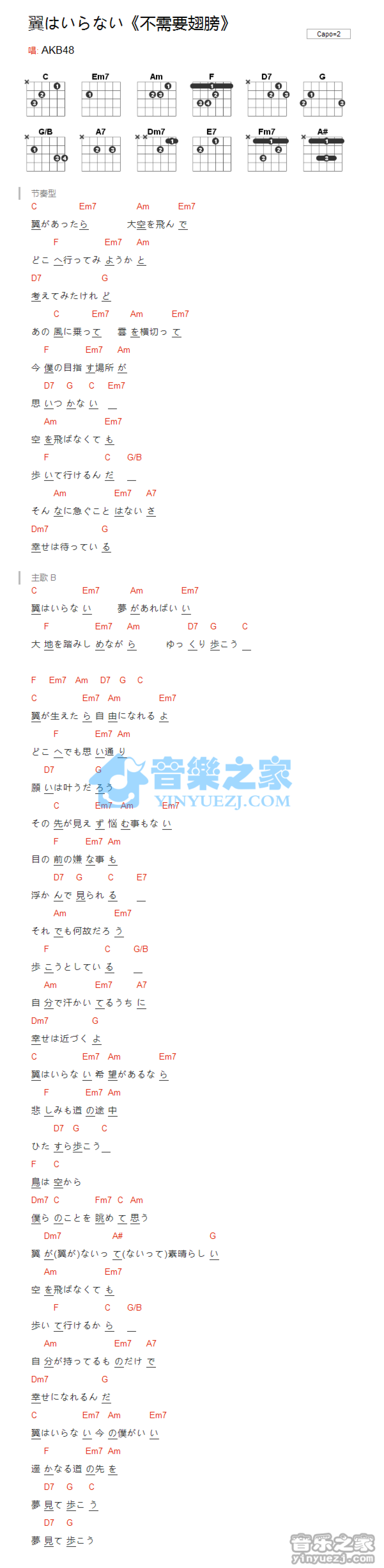 曲谱介绍: AKB48《不需要翅膀》吉他和弦弹唱谱