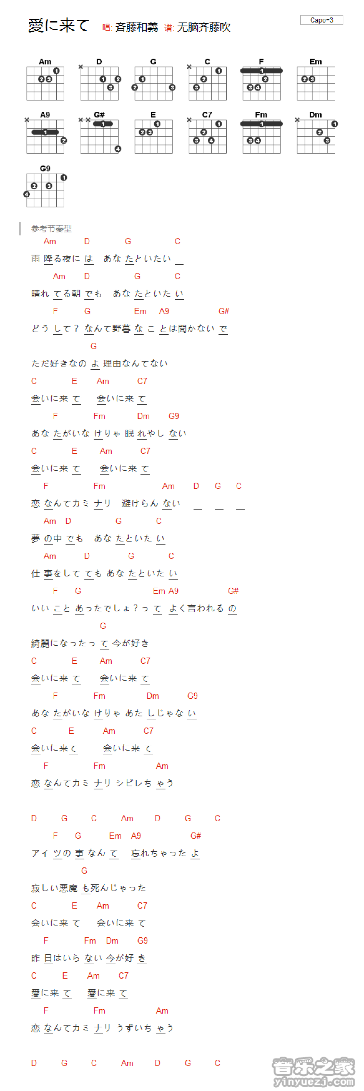 曲谱介绍: 齐藤和义《爱に来て》吉他和弦弹唱谱