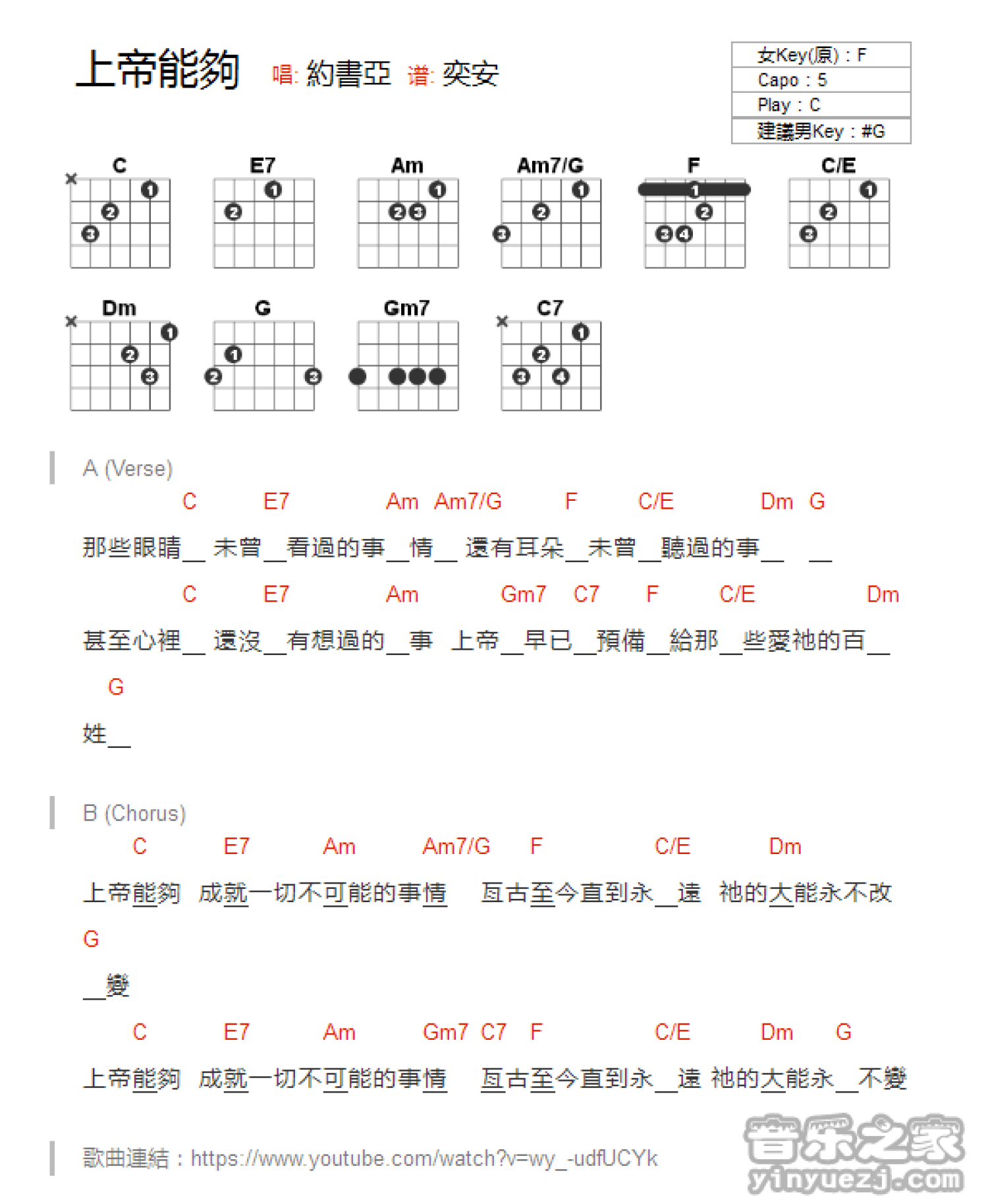 曲谱介绍: C调版约书亚《上帝能够》吉他和弦弹唱谱