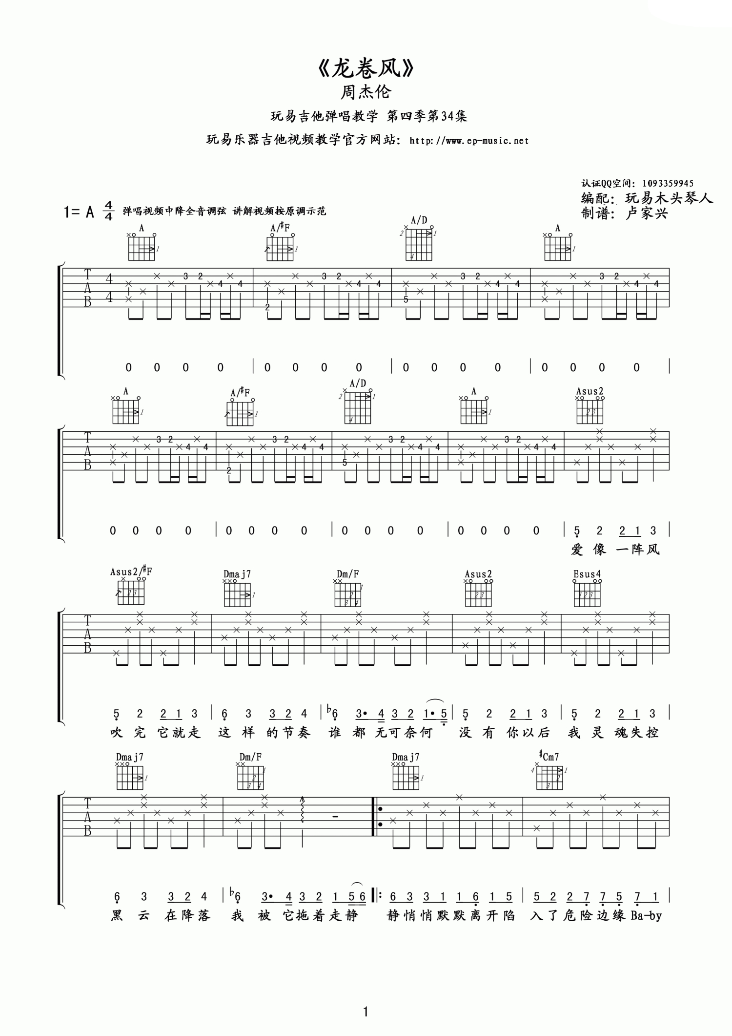 龙卷风吉他谱 - 周杰伦 - A调吉他弹唱谱