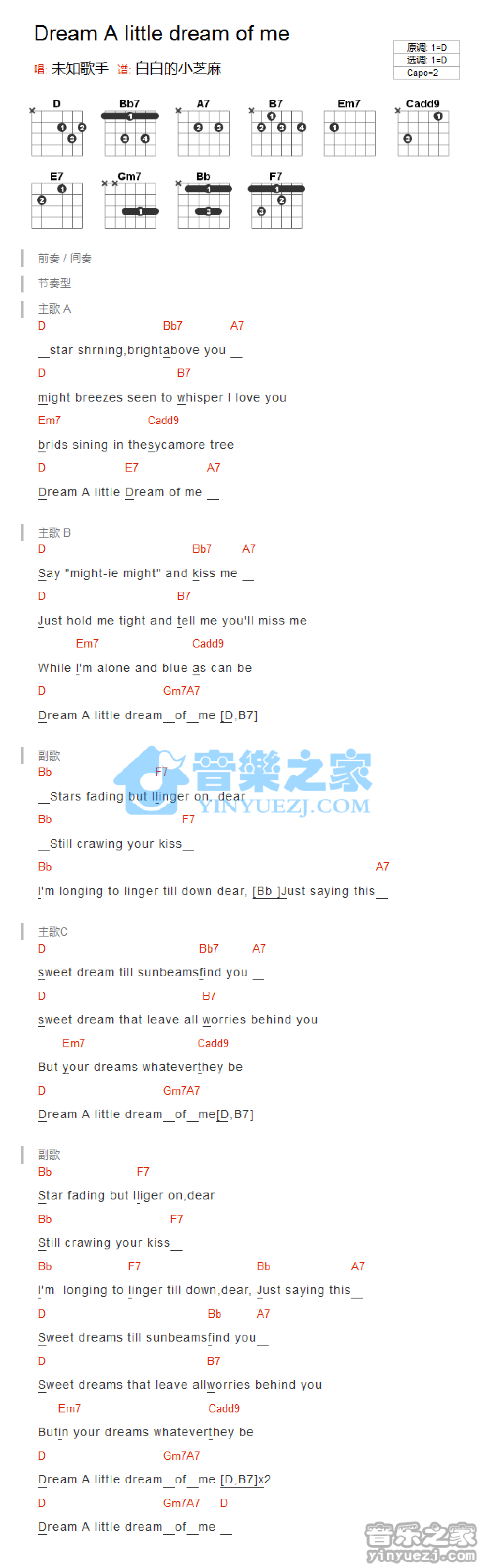 曲谱介绍: D调版《DreamaLittleDreamofMe》吉他和弦弹唱谱
