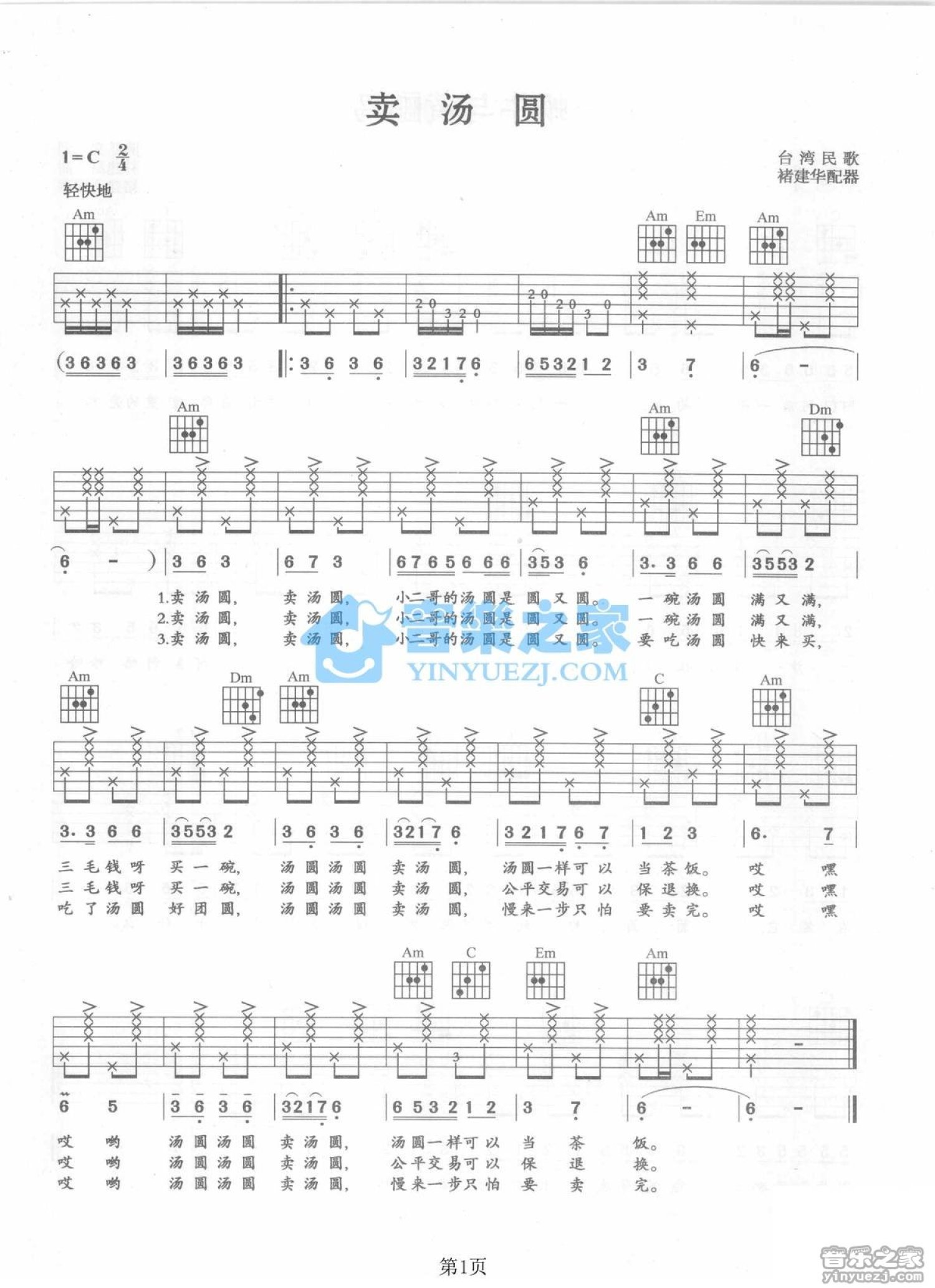曲谱介绍: C调版台湾民谣《卖汤圆》吉他弹唱六线谱