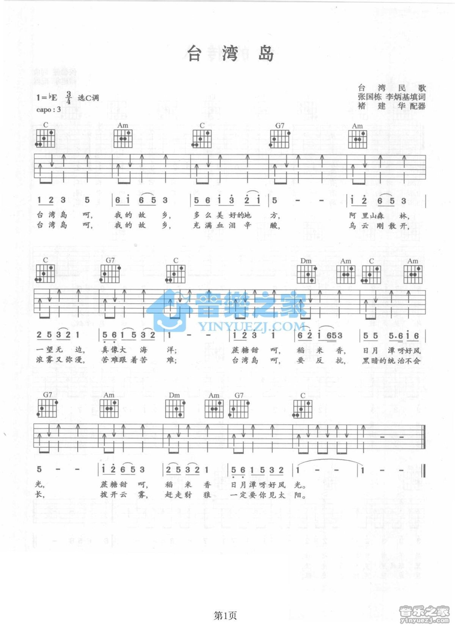 曲谱介绍: C调版《台湾岛》吉他弹唱六线谱
