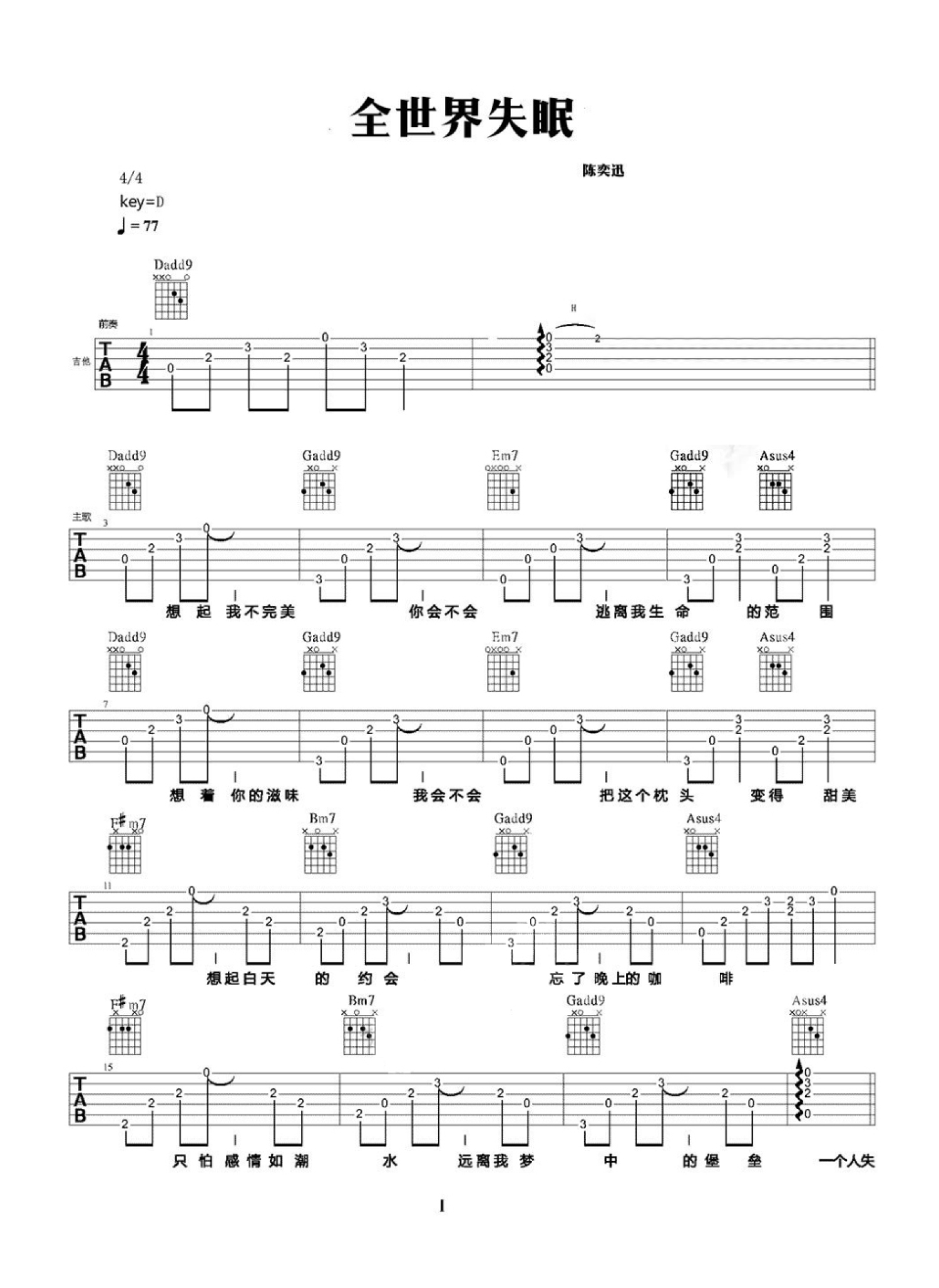 全世界失眠吉他谱 - 陈奕迅 - D调吉他弹唱谱
