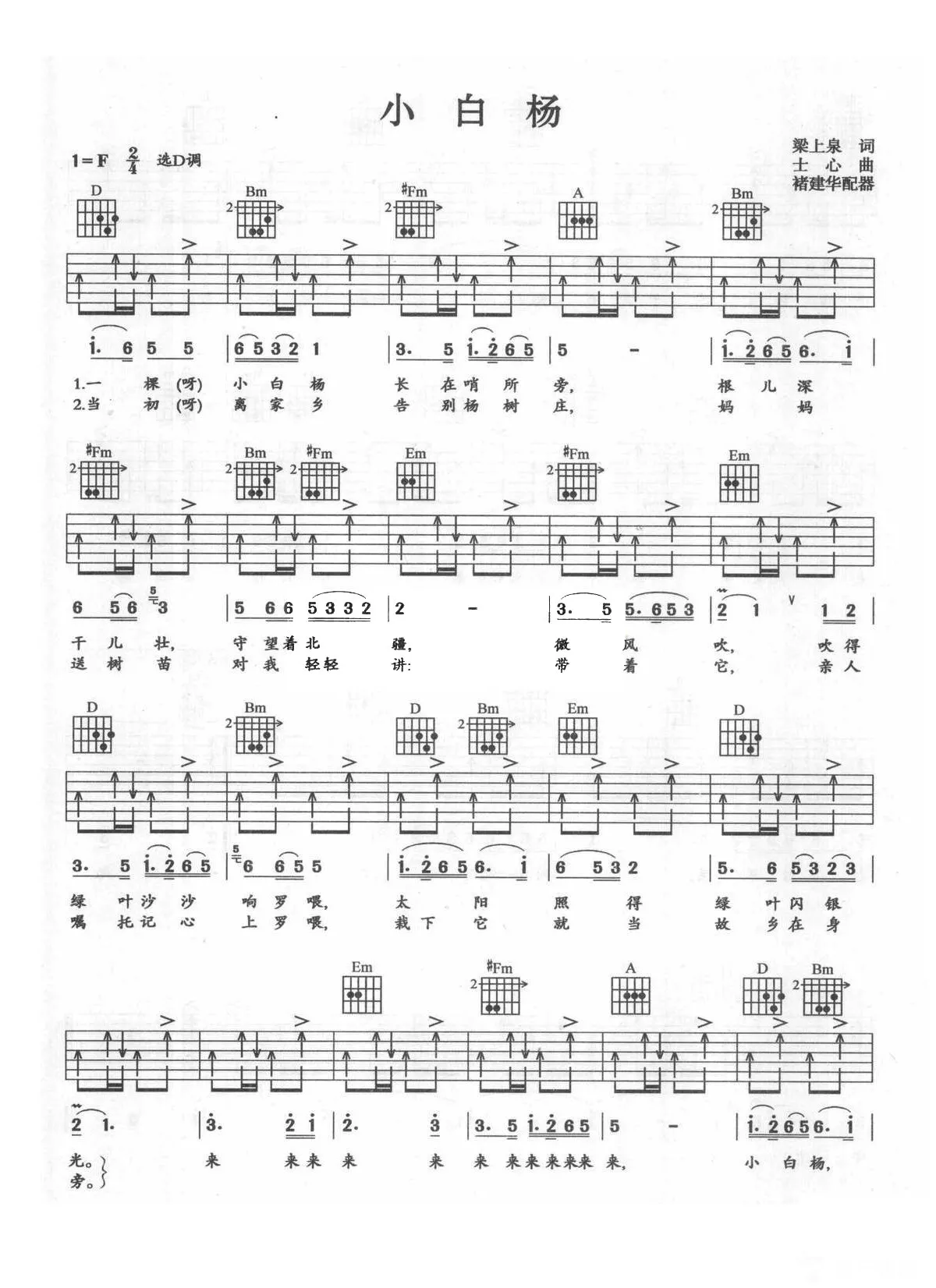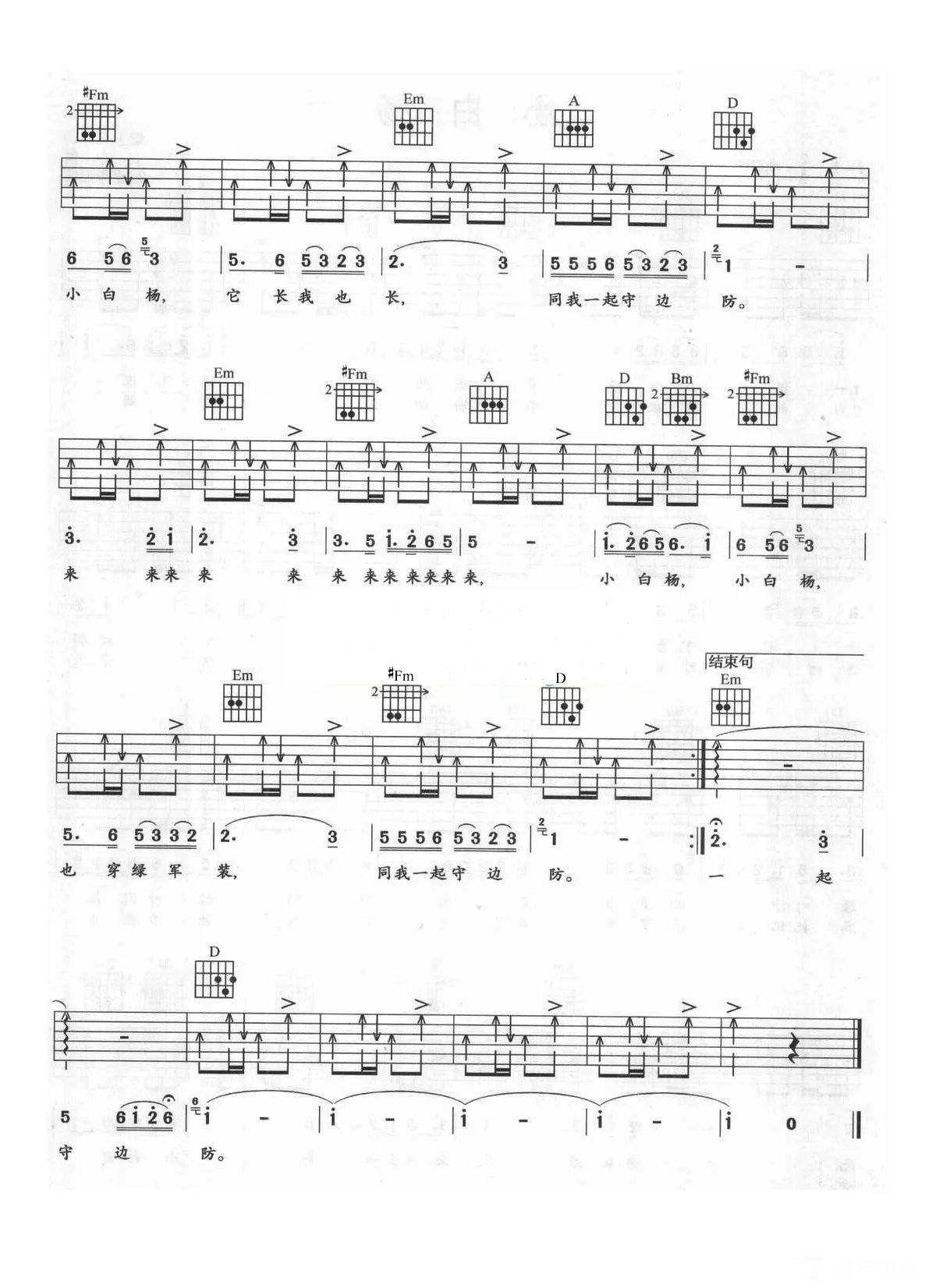 曲谱介绍: D调版军旅歌曲《小白杨》吉他弹唱六线谱