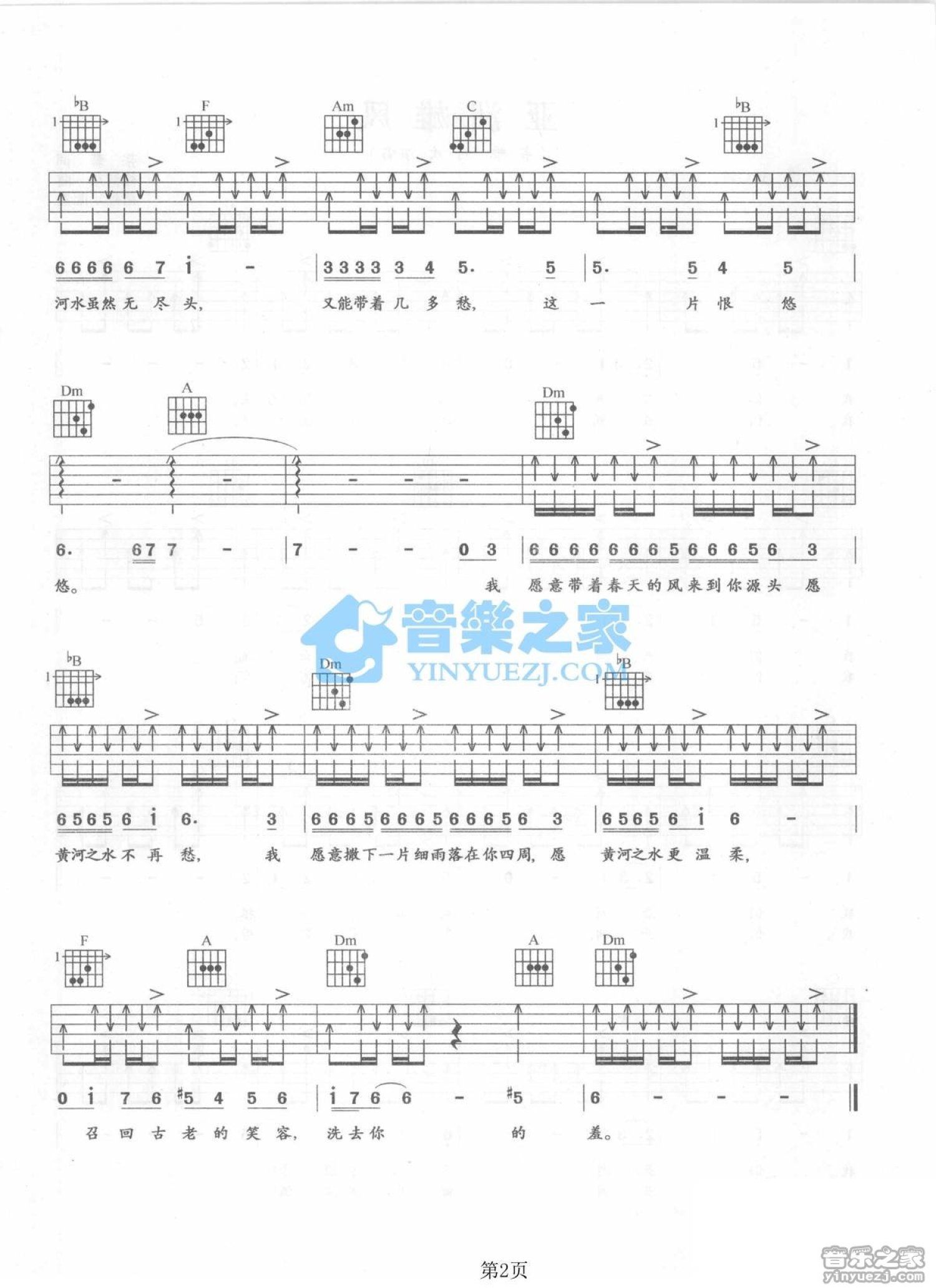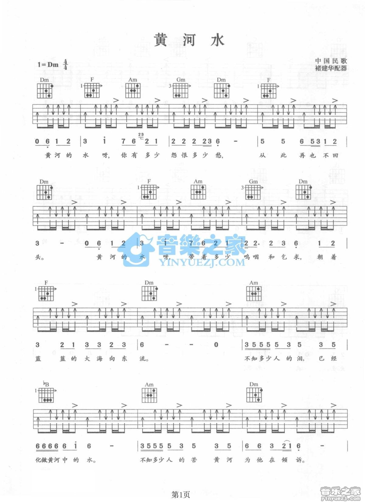 曲谱介绍: Dm调版张江《黄河水》吉他弹唱六线谱