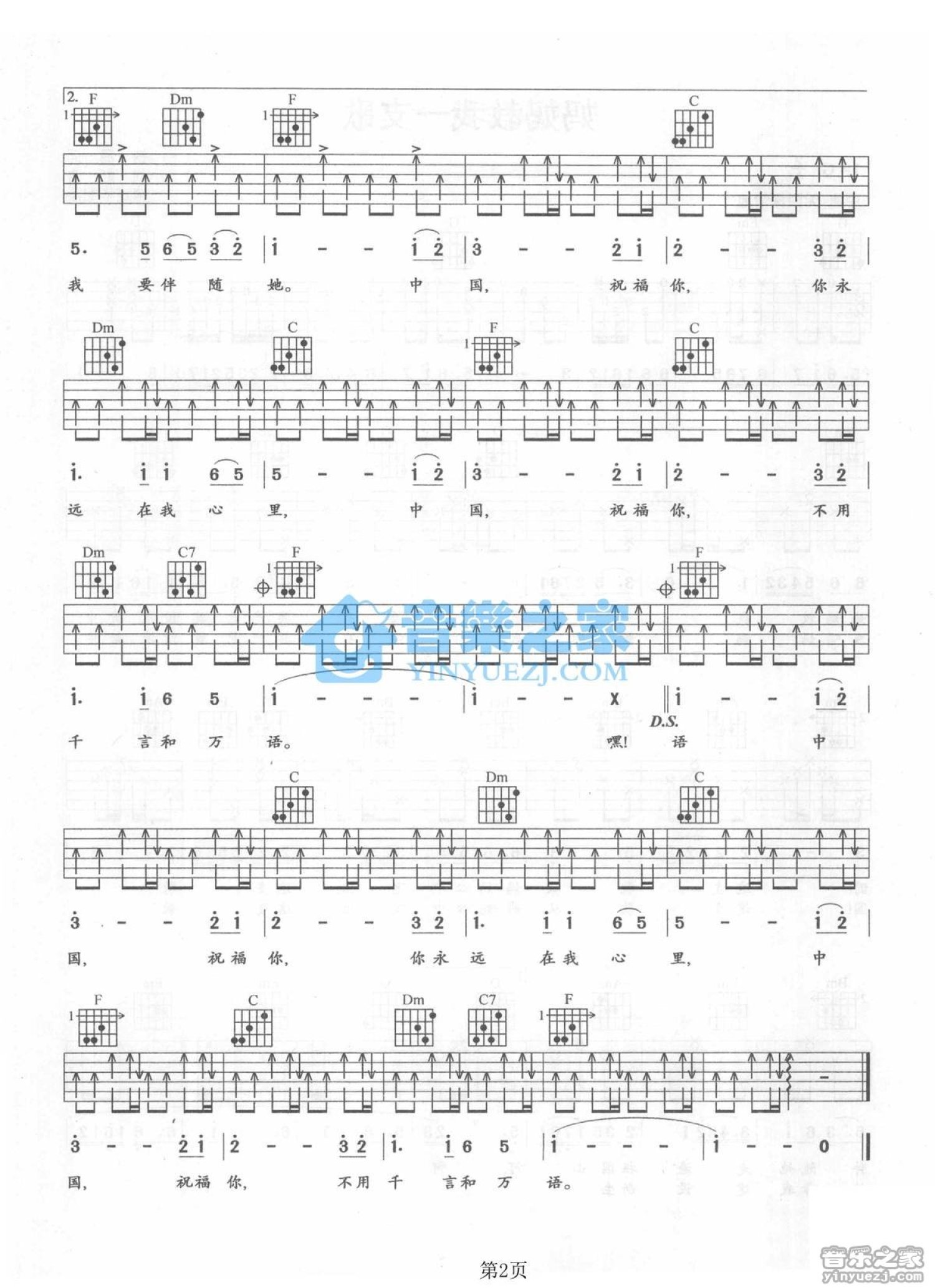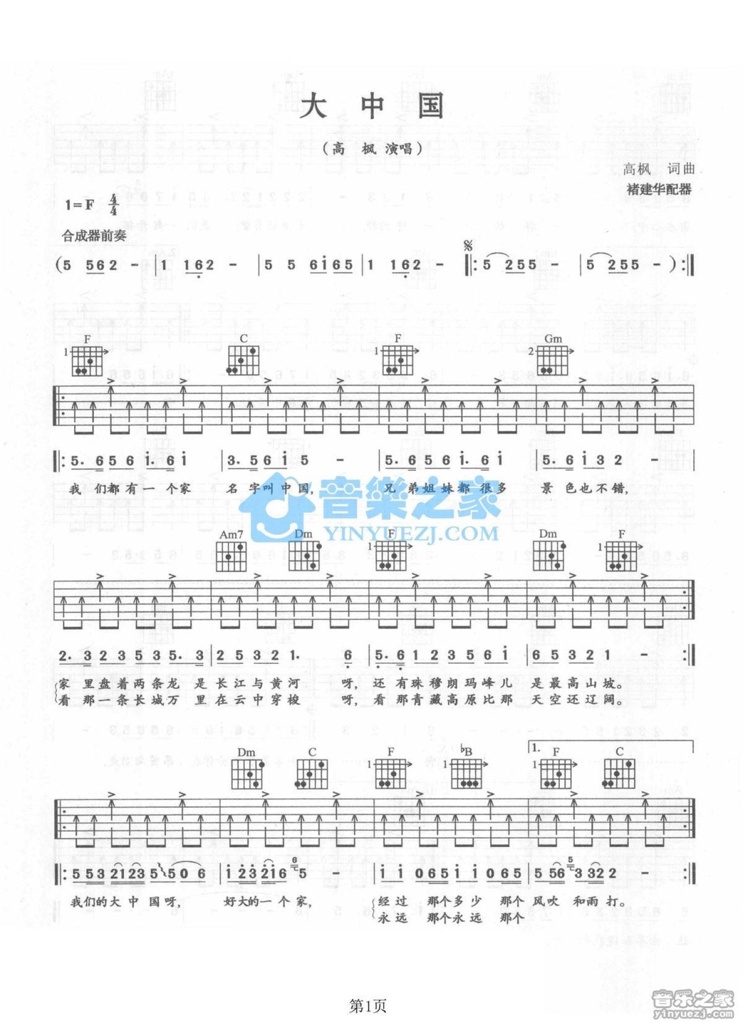 曲谱介绍: F调版《大中国》吉他弹唱六线谱