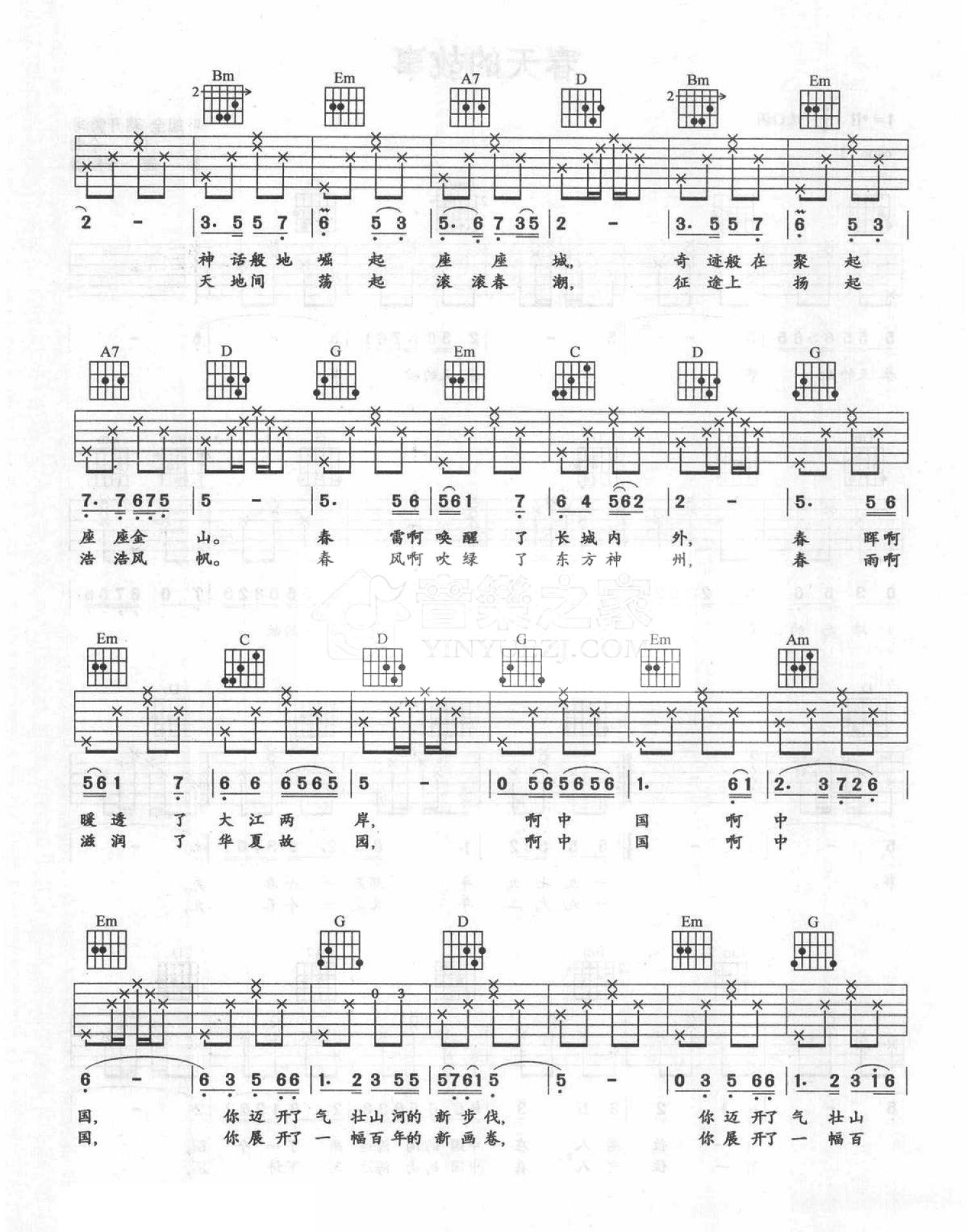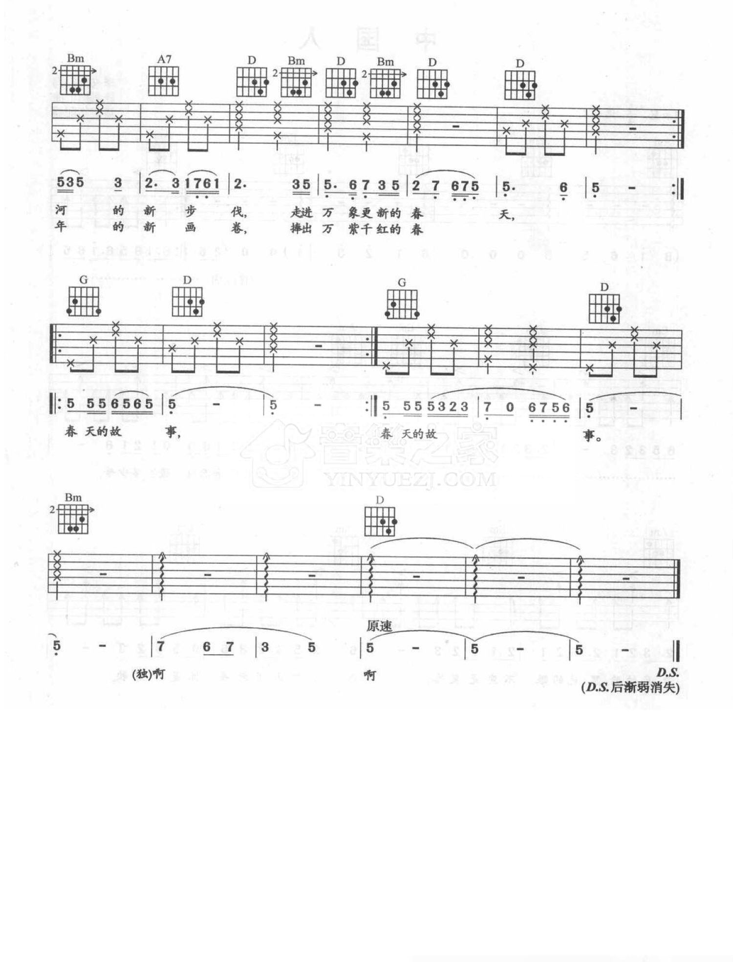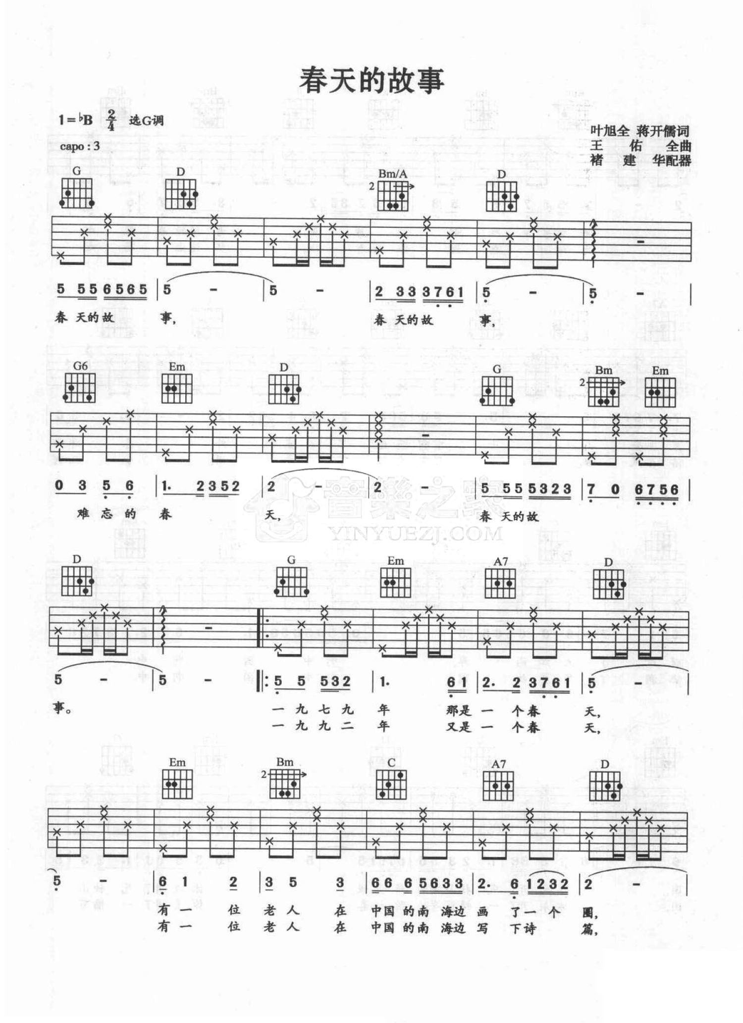 曲谱介绍: G调版 董文华《春天的故事》吉他弹唱六线谱