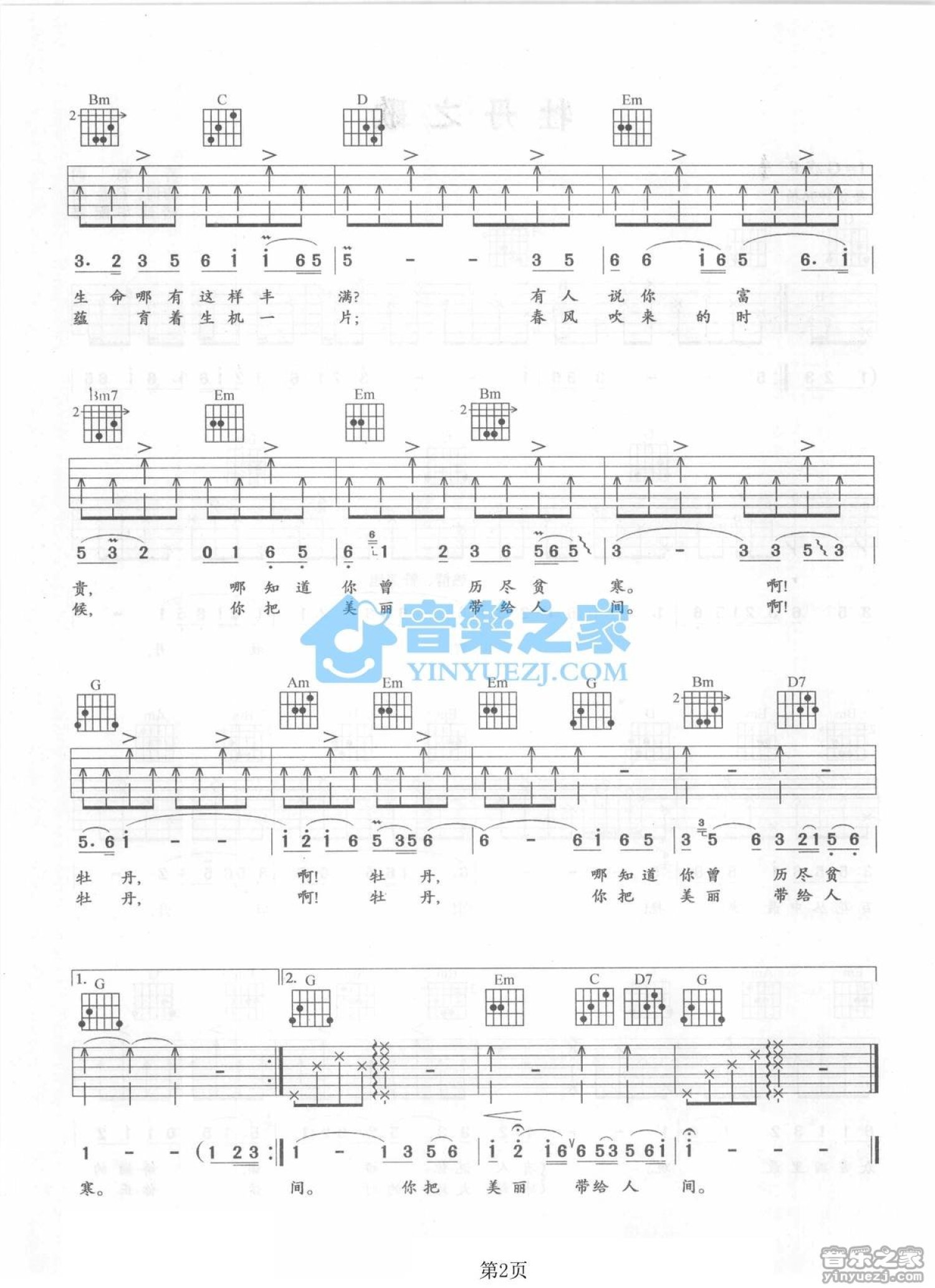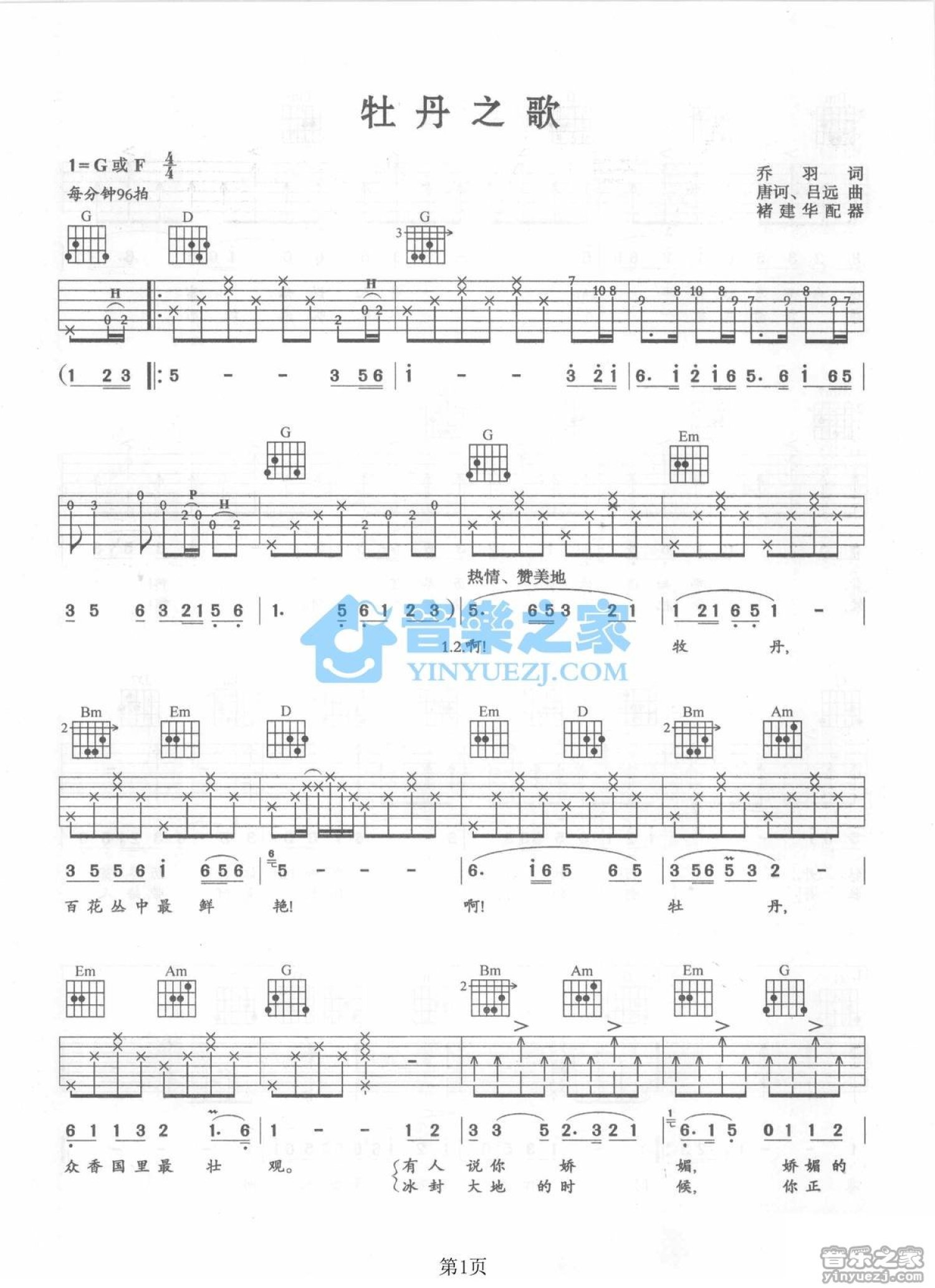 曲谱介绍: G调版蒋大为《牡丹之歌》吉他弹唱六线谱