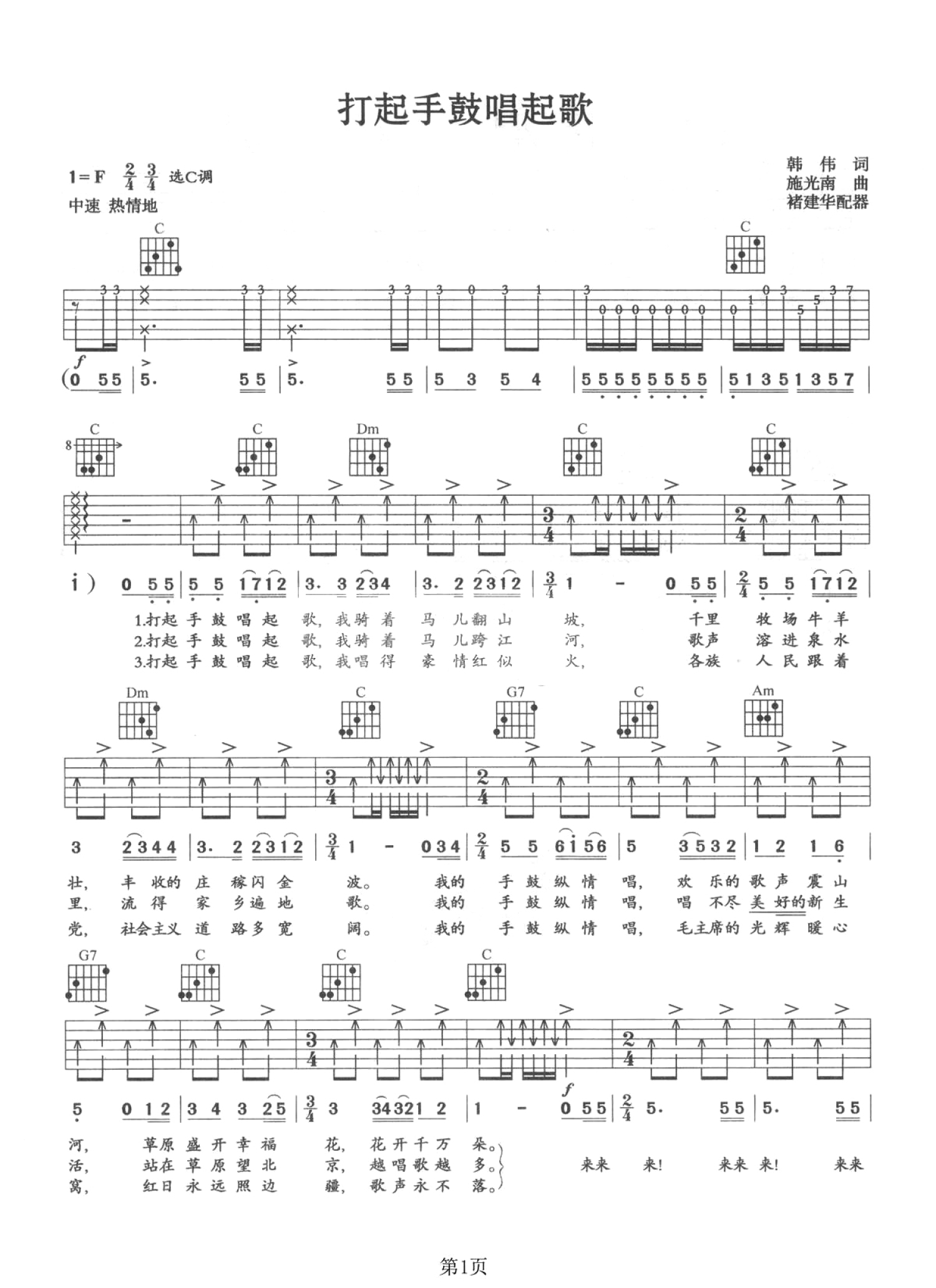 曲谱介绍: C调版红色经典《打起手鼓唱起歌》吉他弹唱六线谱
