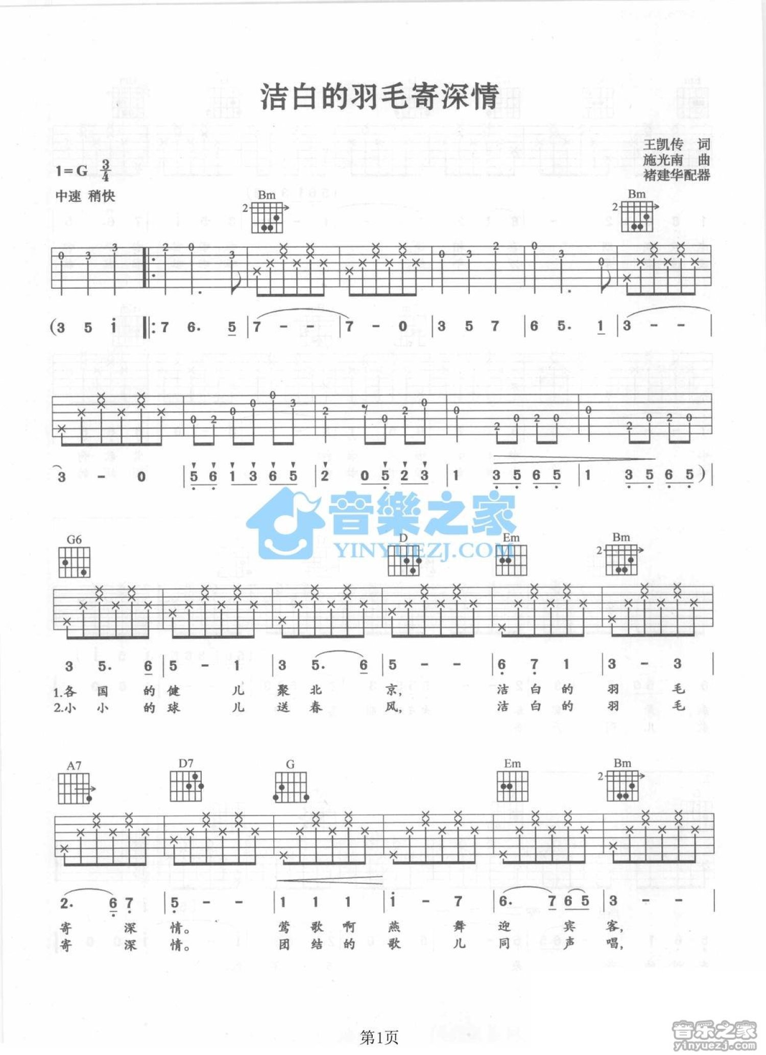 曲谱介绍: G调版《洁白的羽毛寄深情》吉他弹唱六线谱