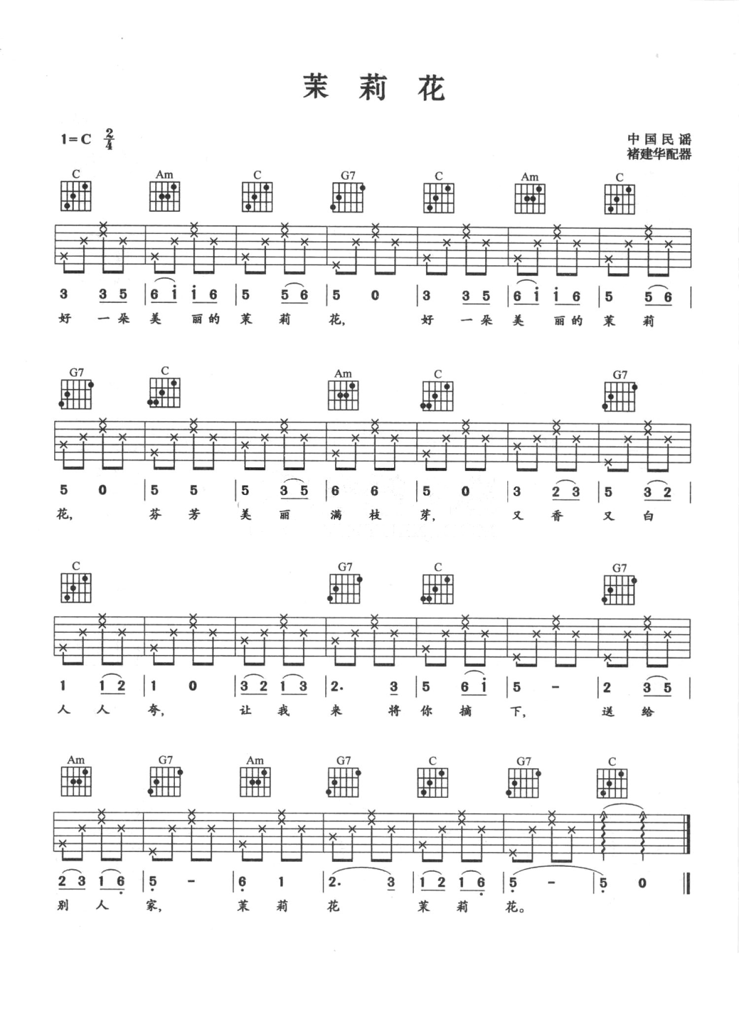 曲谱介绍: C调版《茉莉花》吉他弹唱六线谱