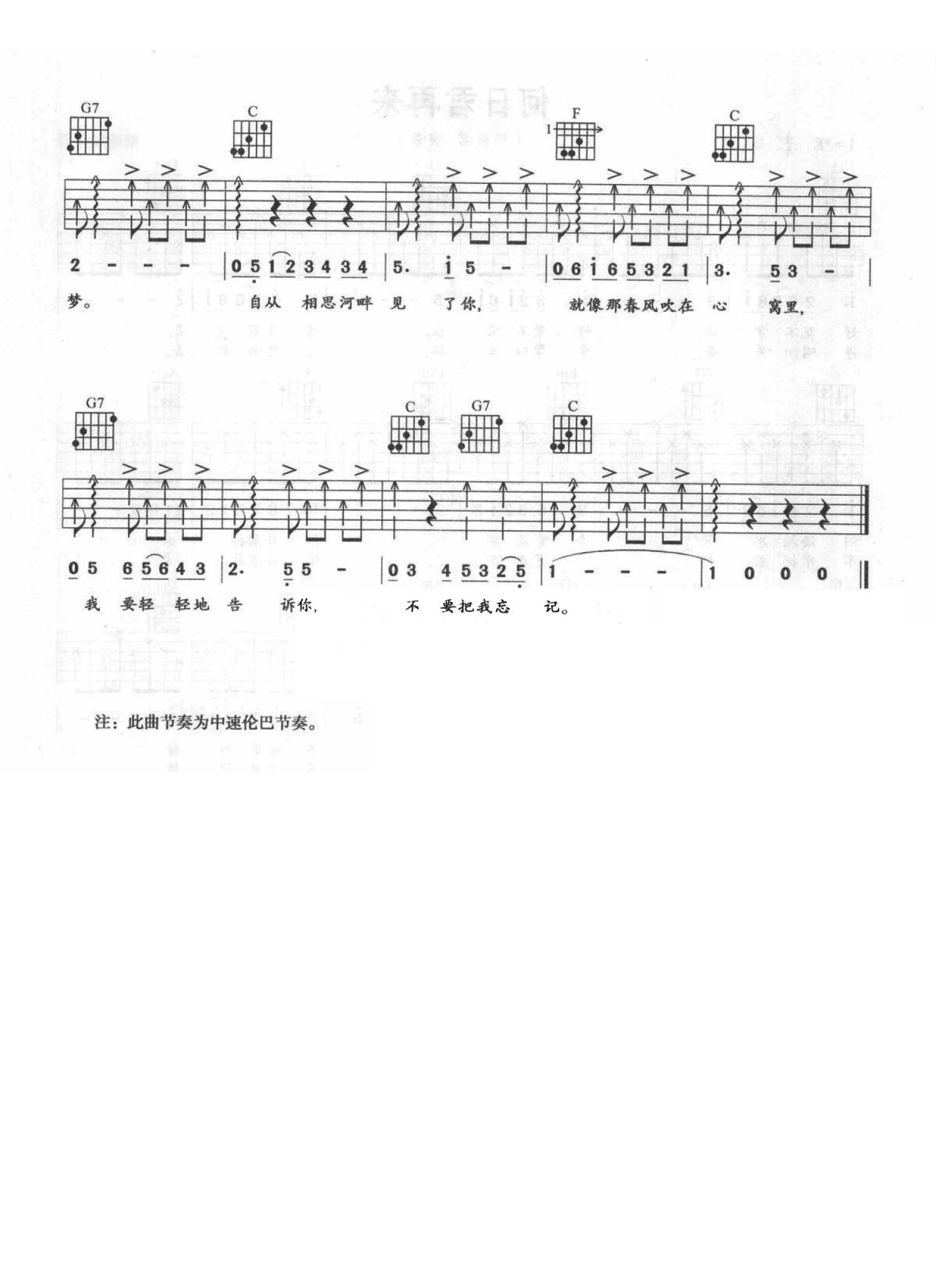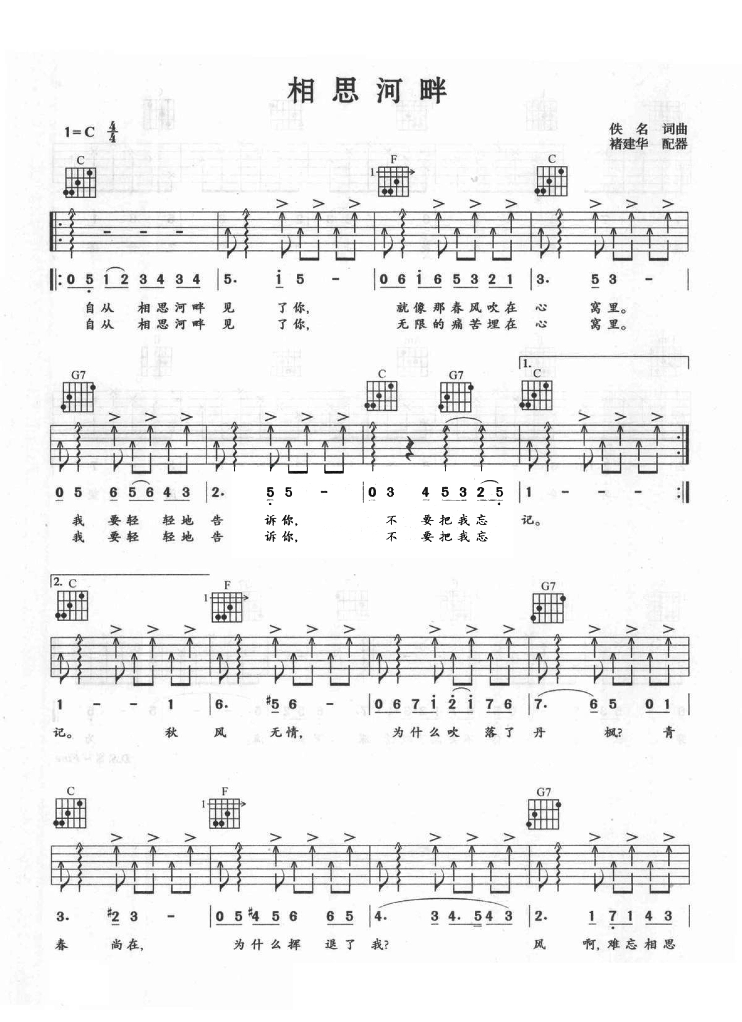 曲谱介绍: C调版民谣《相思河畔》吉他弹唱六线谱
