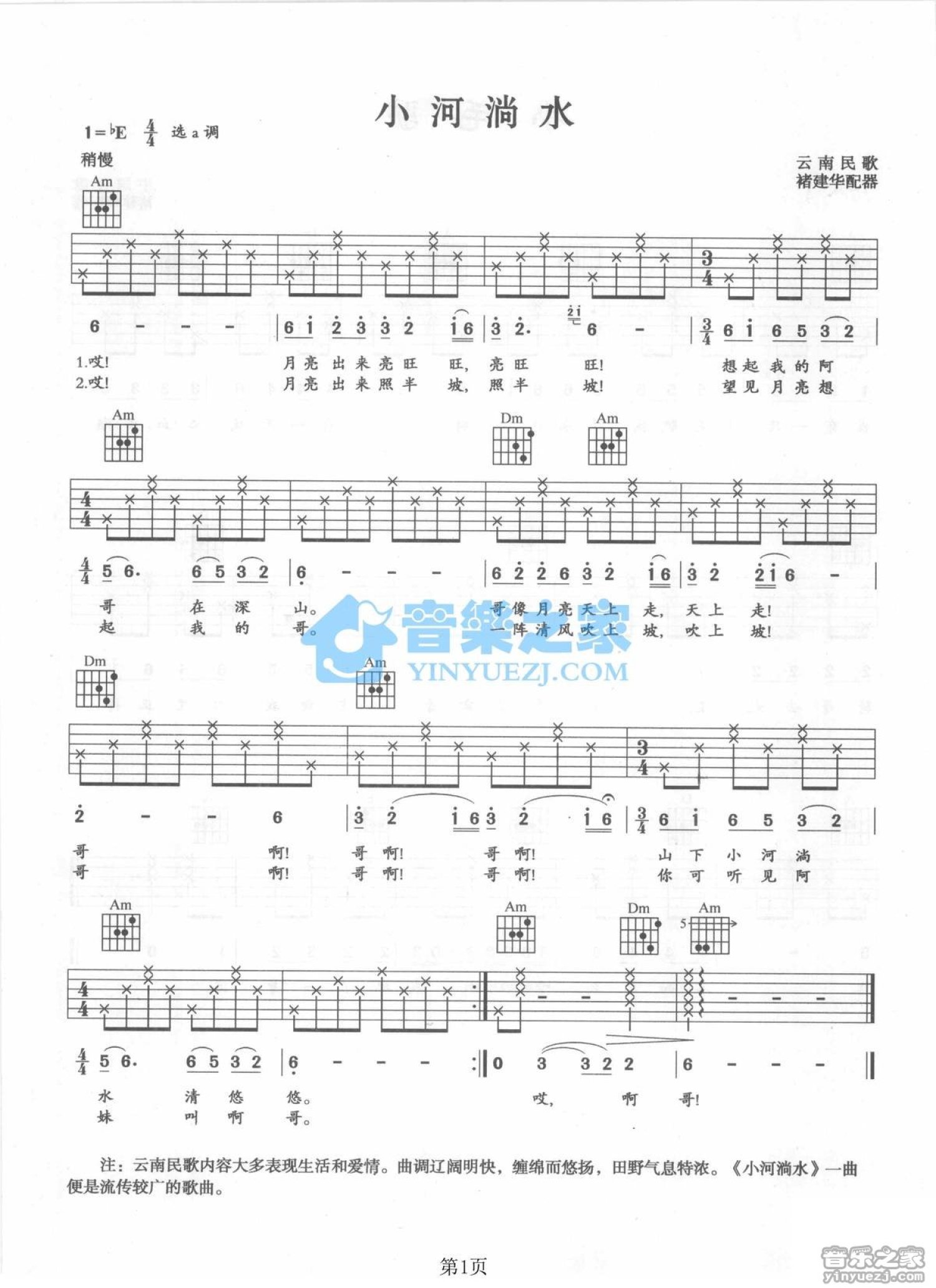 曲谱介绍: A调版云南民歌《小河淌水》吉他弹唱六线谱