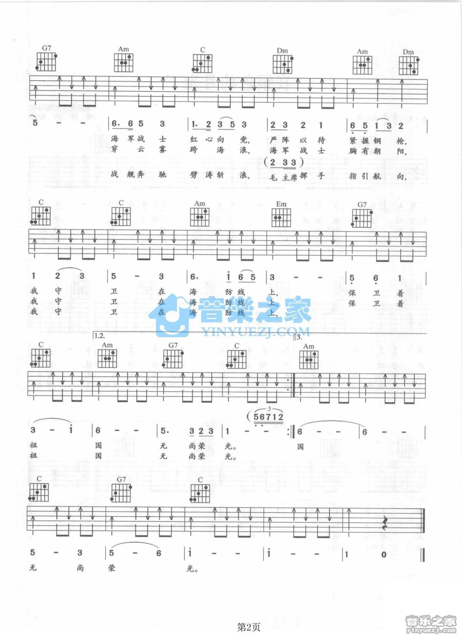 曲谱介绍: C调版 军歌《我爱这蓝色的海洋》吉他弹唱六线谱