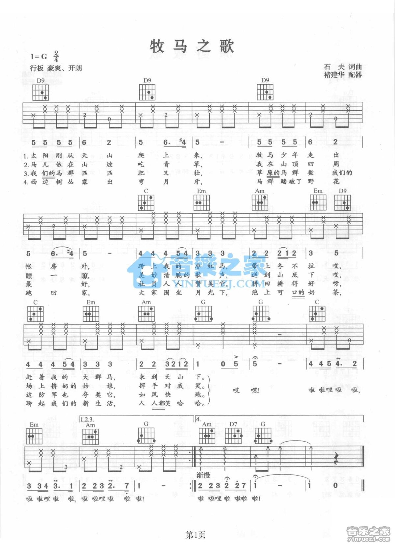 曲谱介绍: G调版民歌《牧马之歌》吉他弹唱六线谱