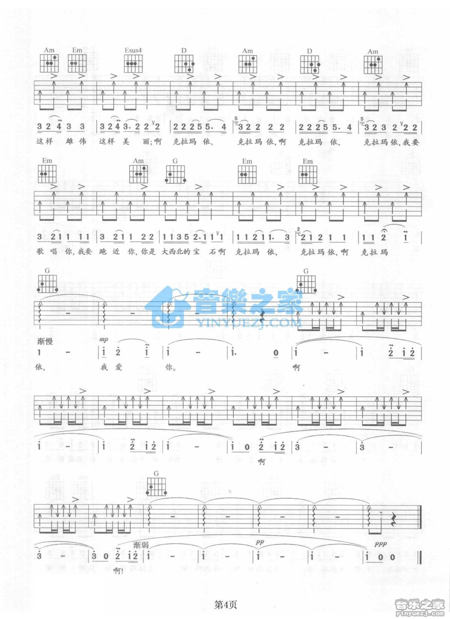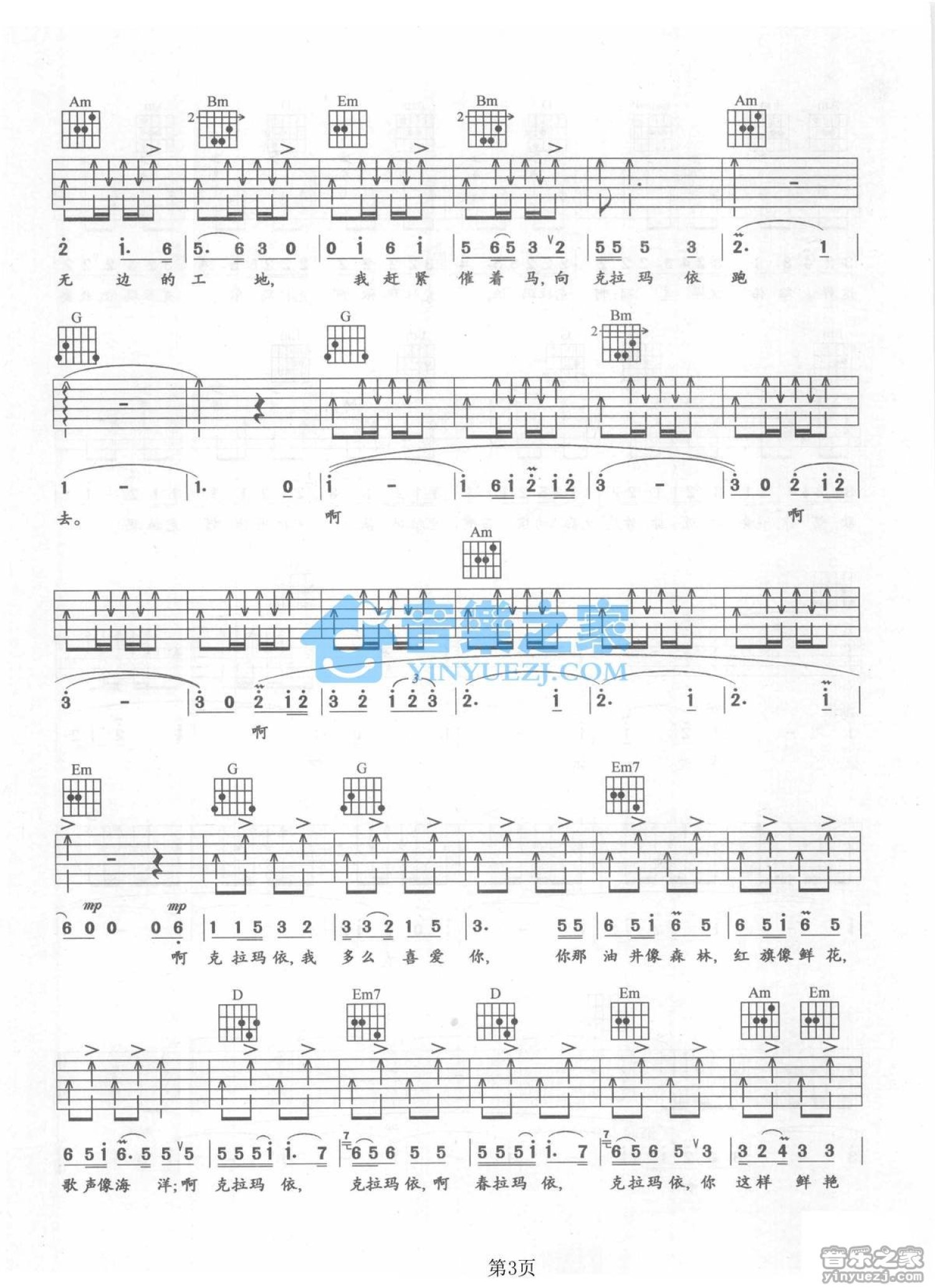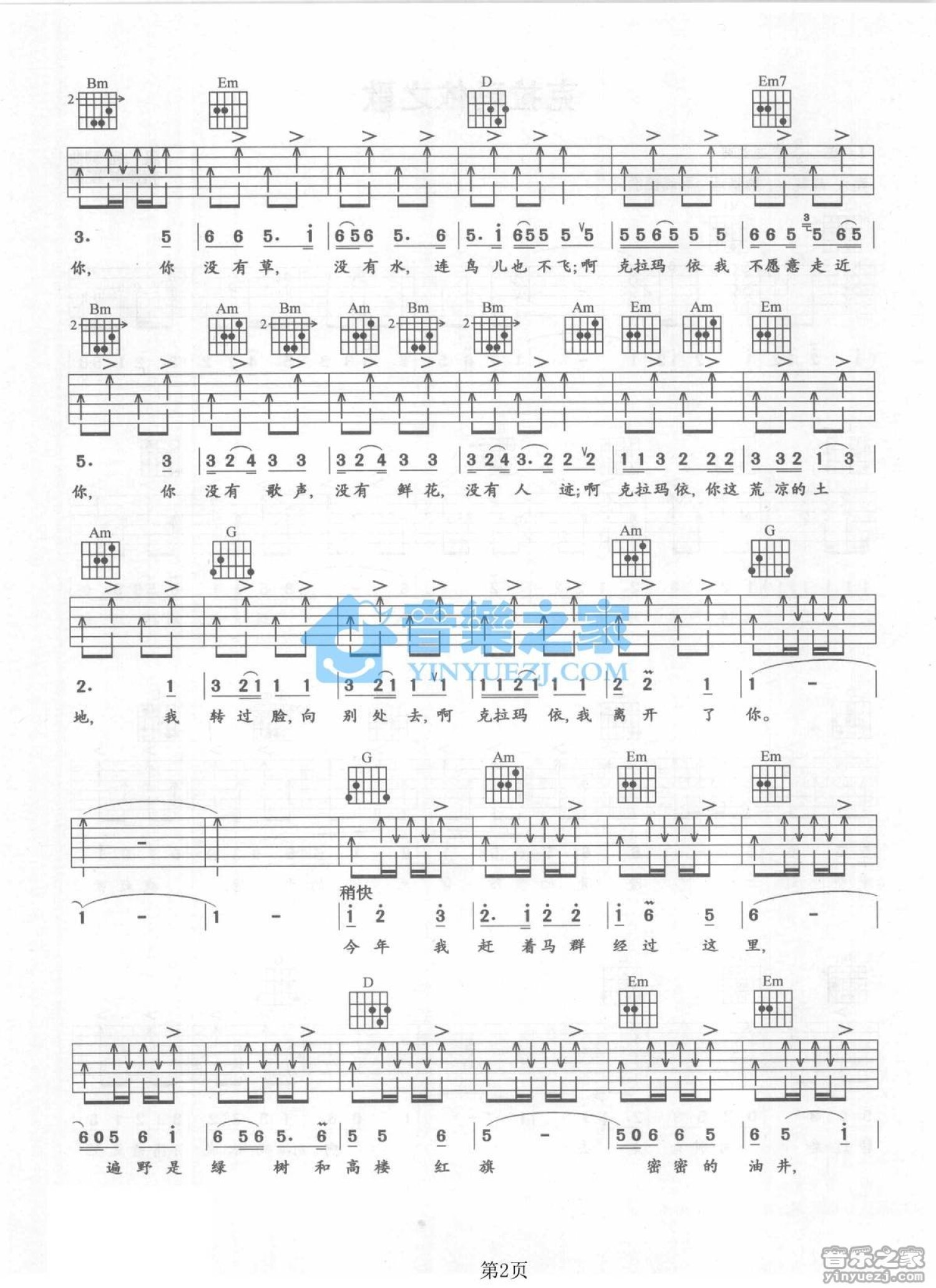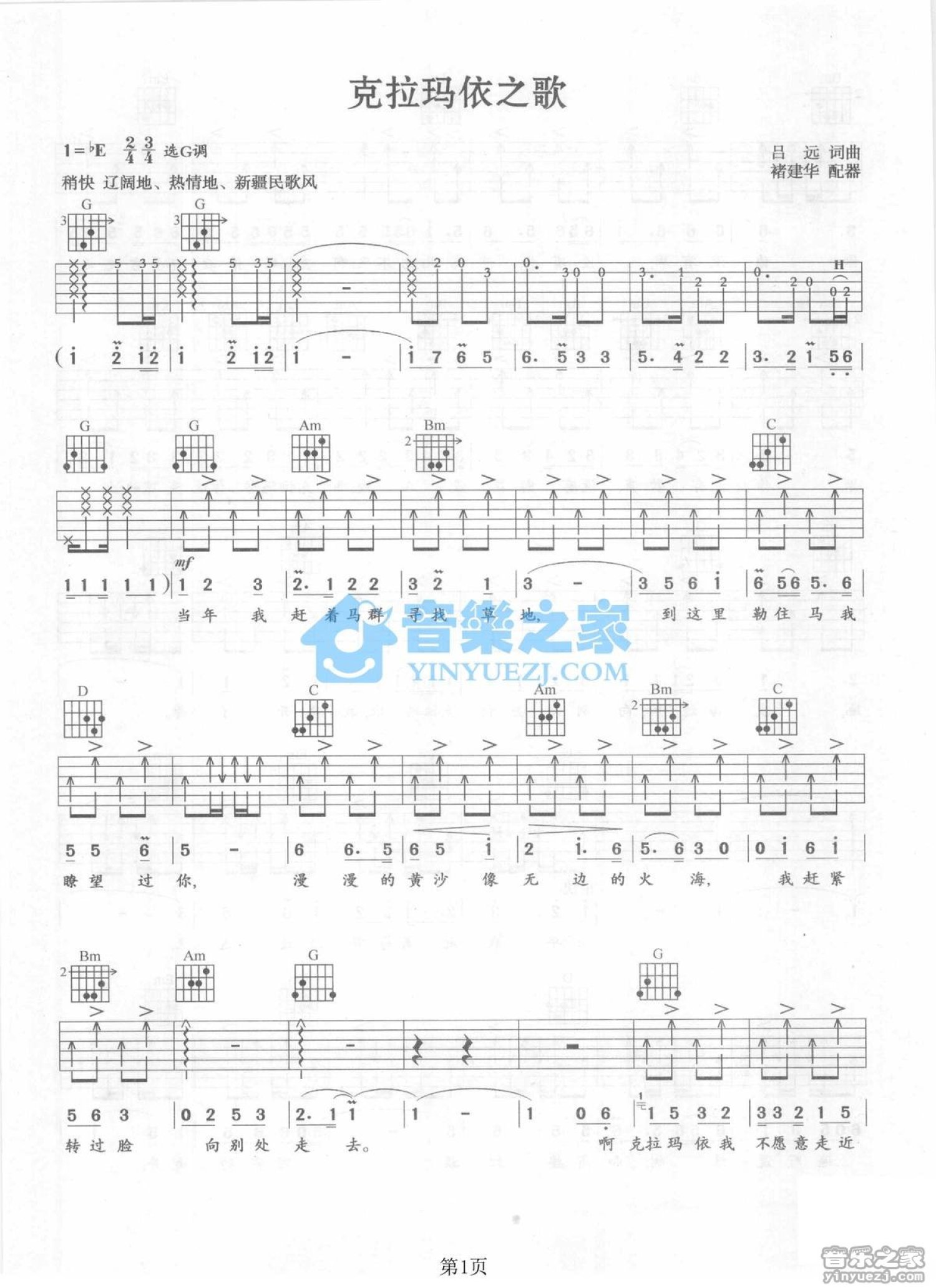 曲谱介绍: G调版民歌《克拉玛依之歌》吉他弹唱六线谱
