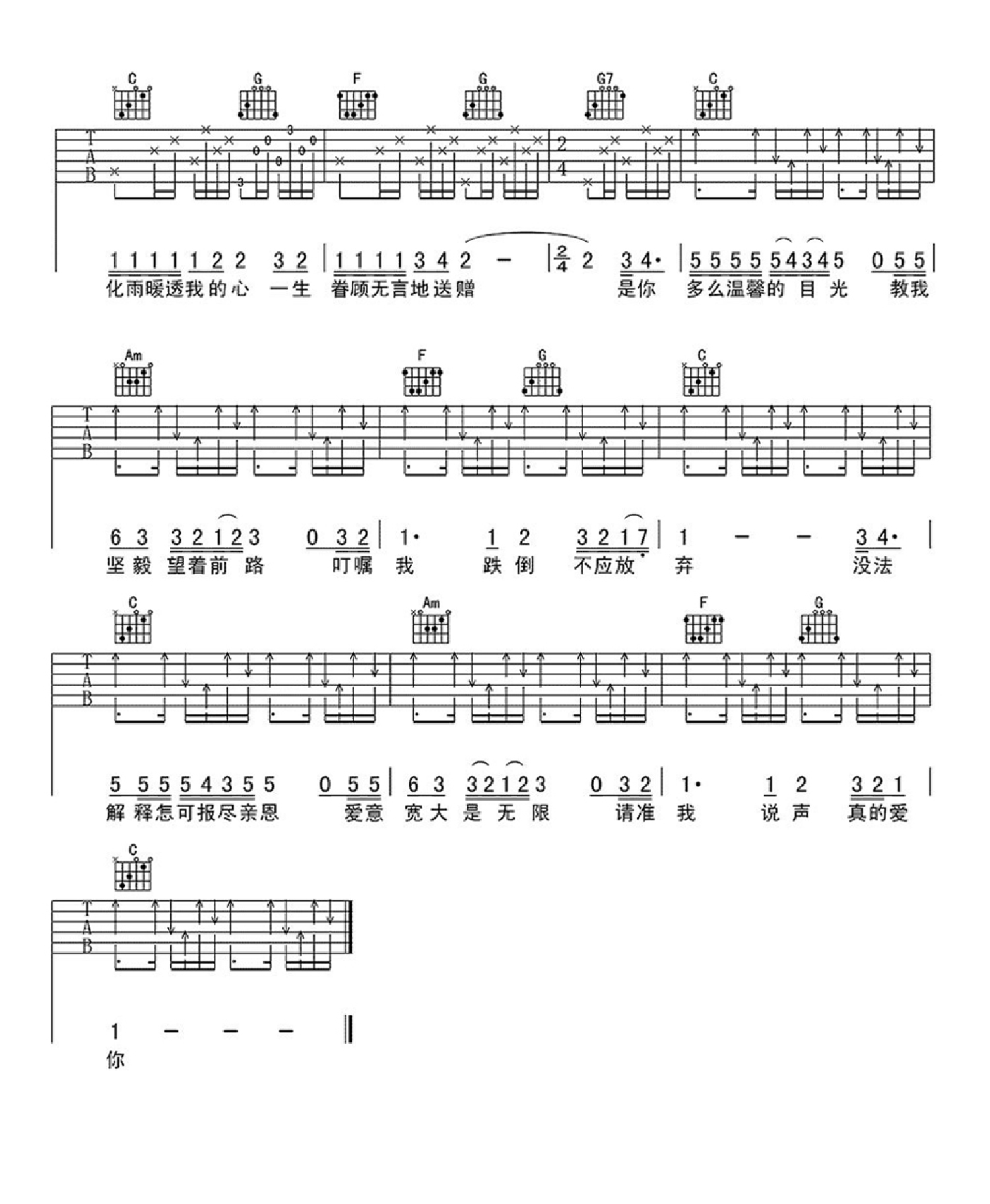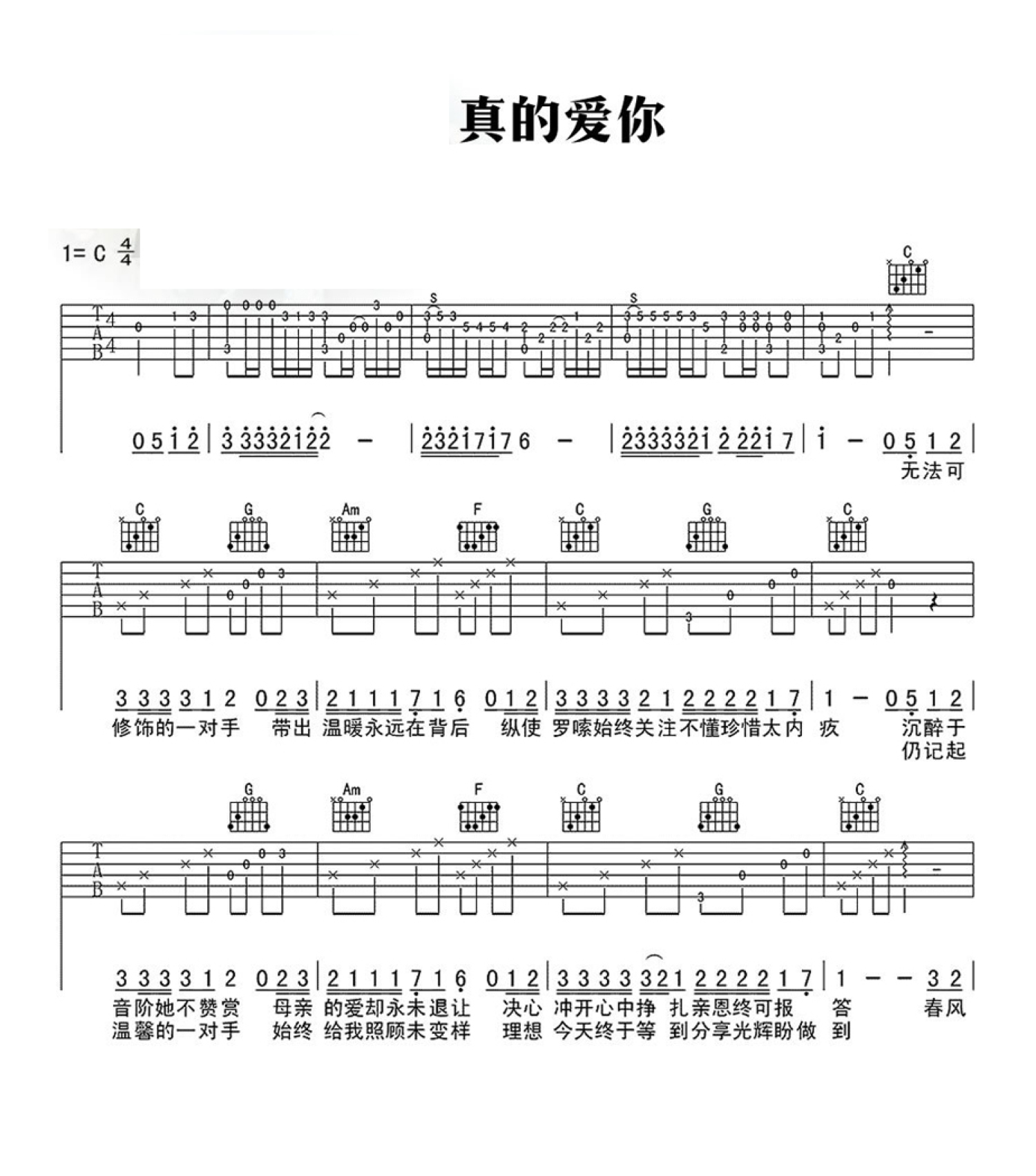 曲谱介绍: Beyond真的爱你吉他谱,高清图片谱。C调指法和弦编配,真的爱你吉他六线谱。Beyond为母亲节而写的《真的爱你》,无法解释怎可报尽亲恩,爱意宽大是无限,请准我说声真的爱你。对每一个歌迷来说不仅仅是超越,也是爱的超越。