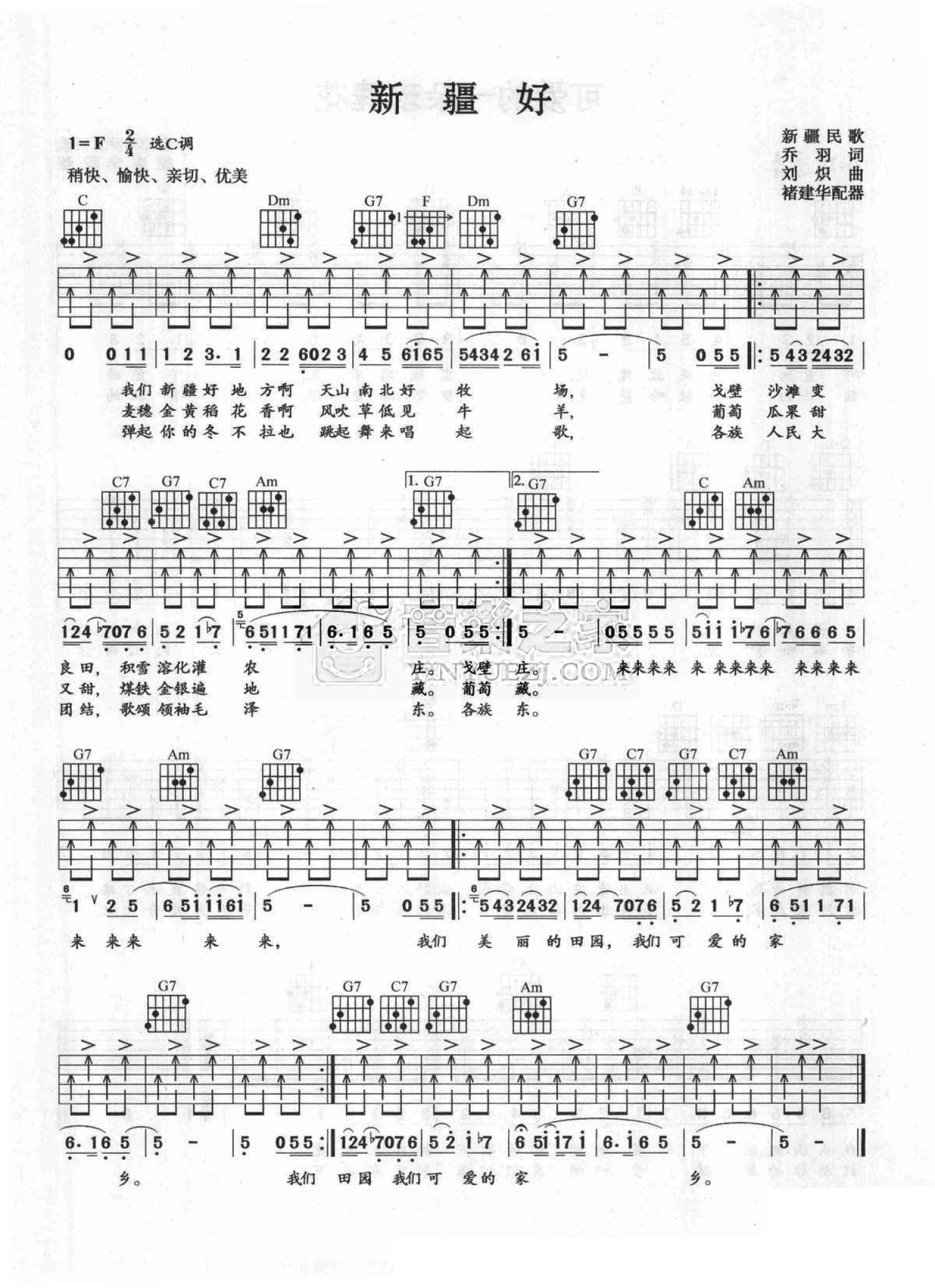 曲谱介绍: C调版新疆民歌《新疆好》吉他弹唱六线谱
