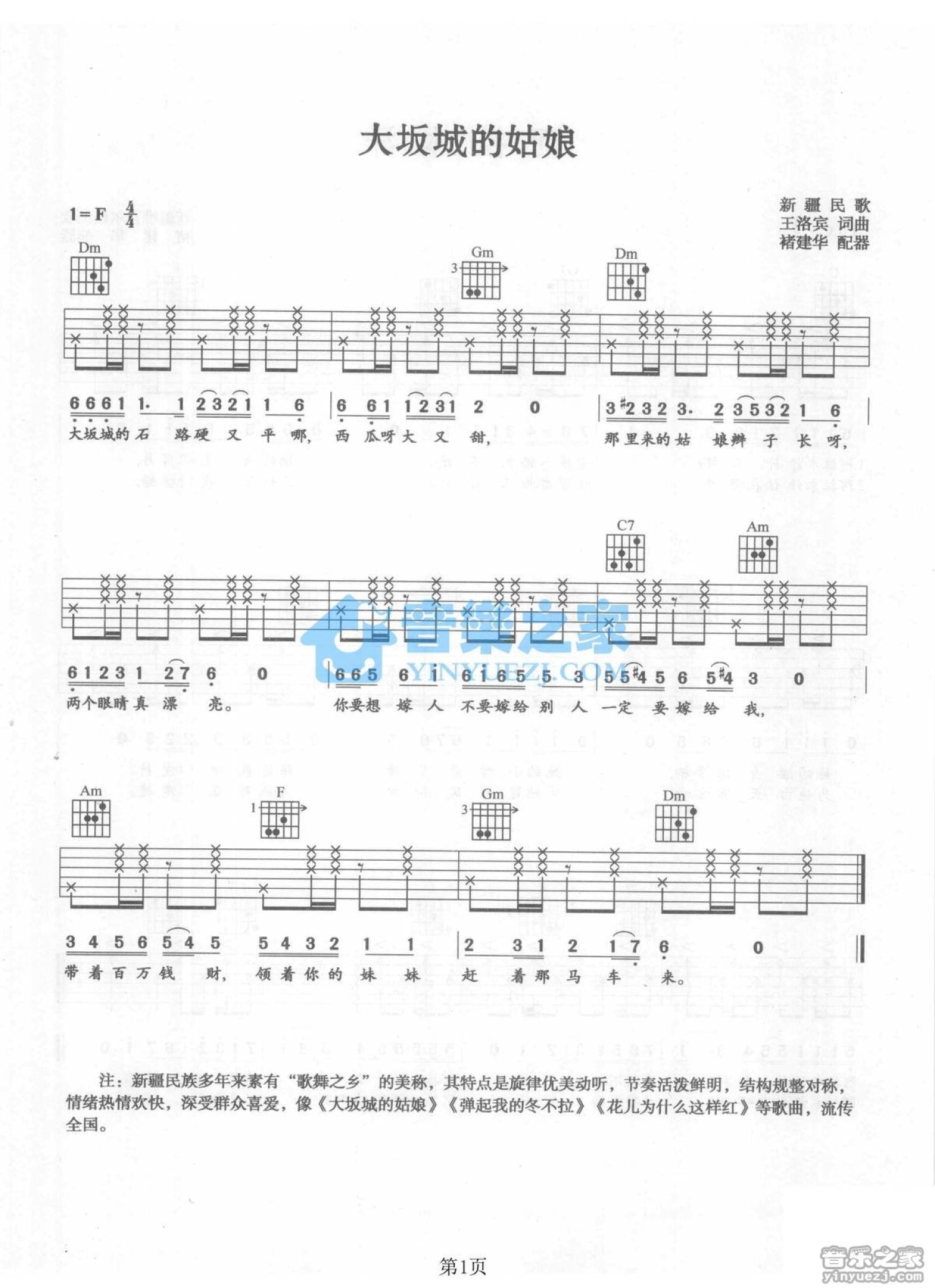 大阪城的姑娘吉他谱 - 新疆民歌 - F调吉他弹唱谱