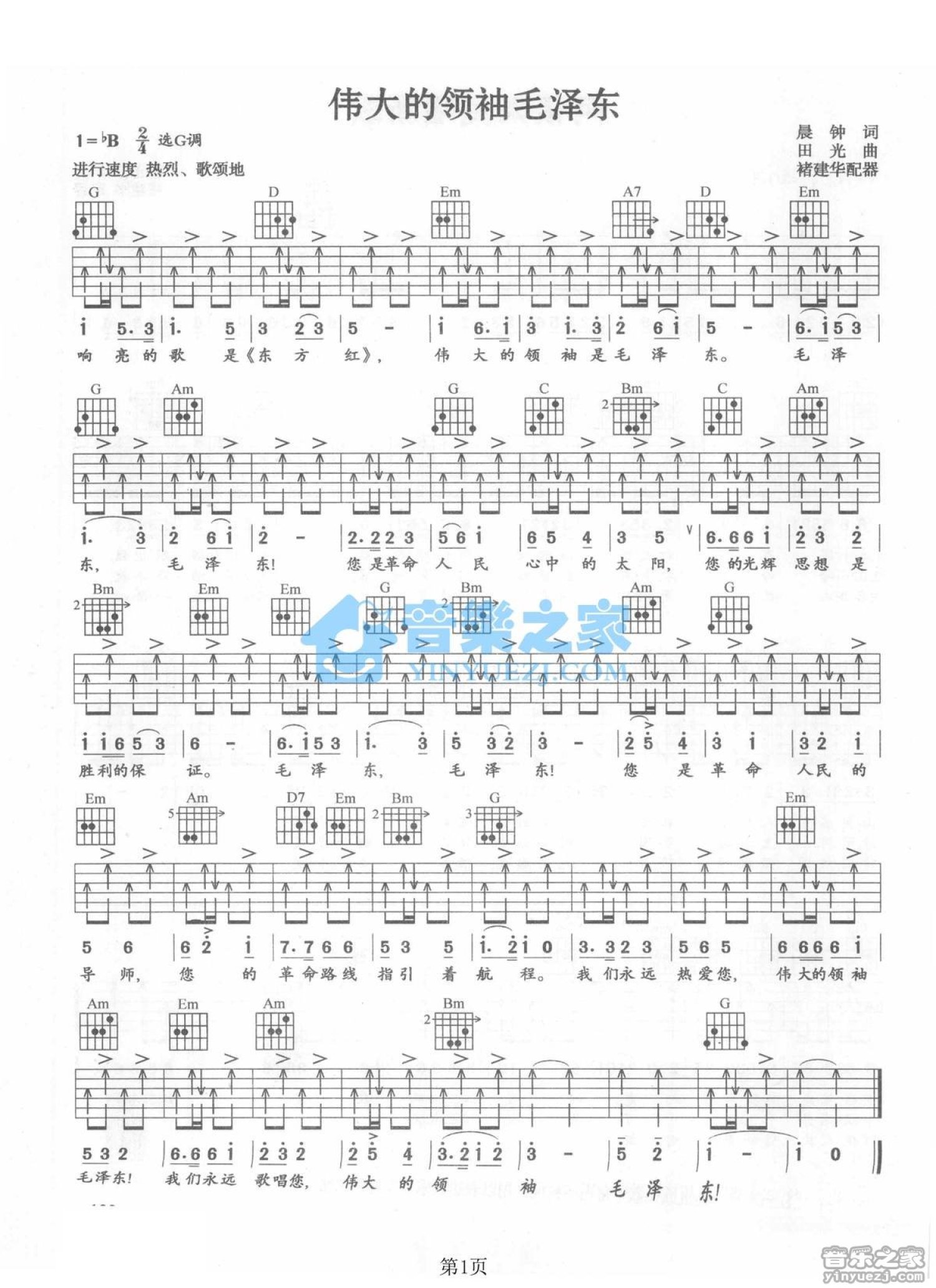曲谱介绍: G调版红色歌曲《伟大的领袖毛泽东》吉他弹唱六线谱