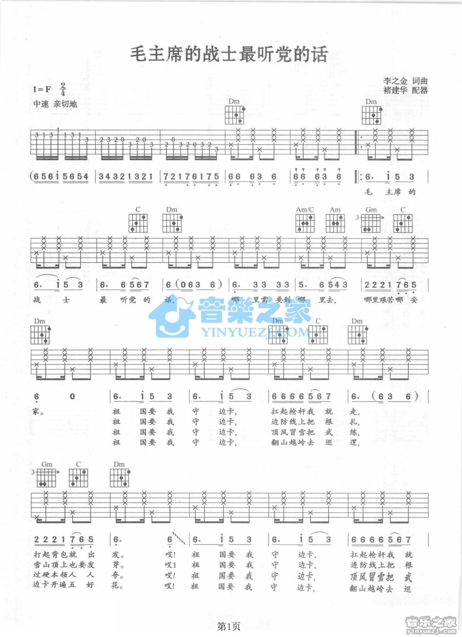 曲谱介绍: F调版经典红歌《毛主席的战士最听党的话》吉他弹唱六线谱