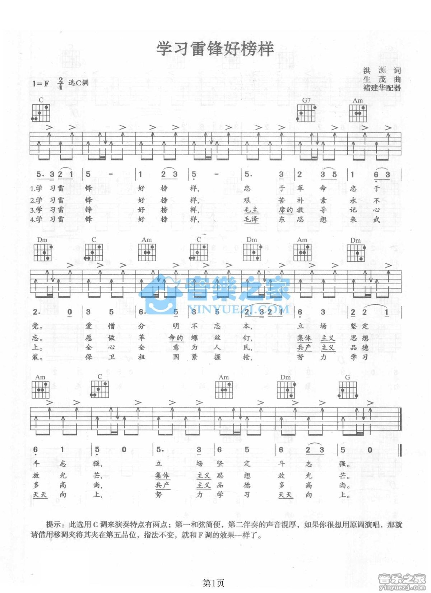 曲谱介绍: C调版军歌《学习雷锋好榜样》吉他弹唱六线谱