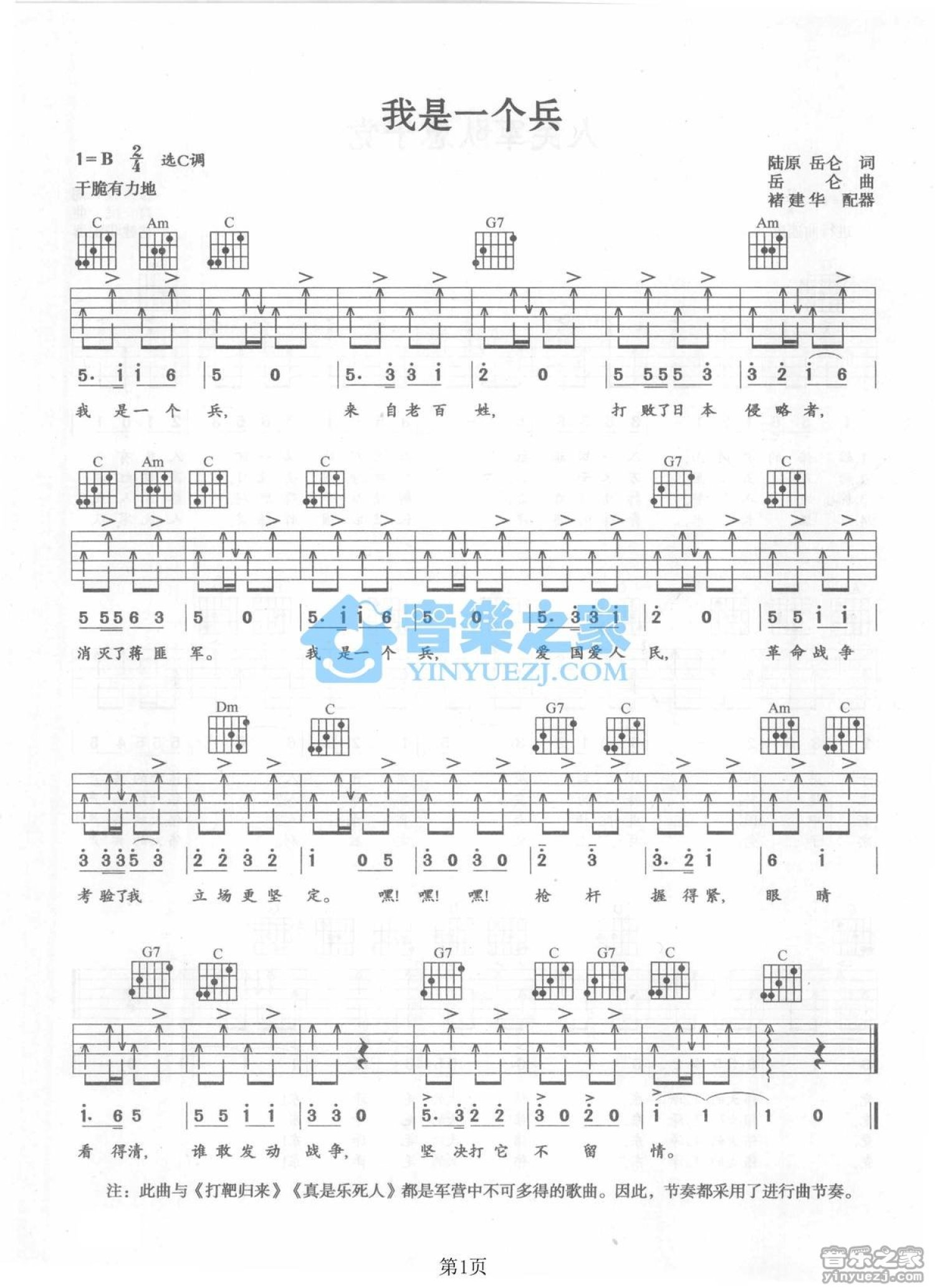 曲谱介绍: C调版军歌《我是一个兵》吉他弹唱六线谱