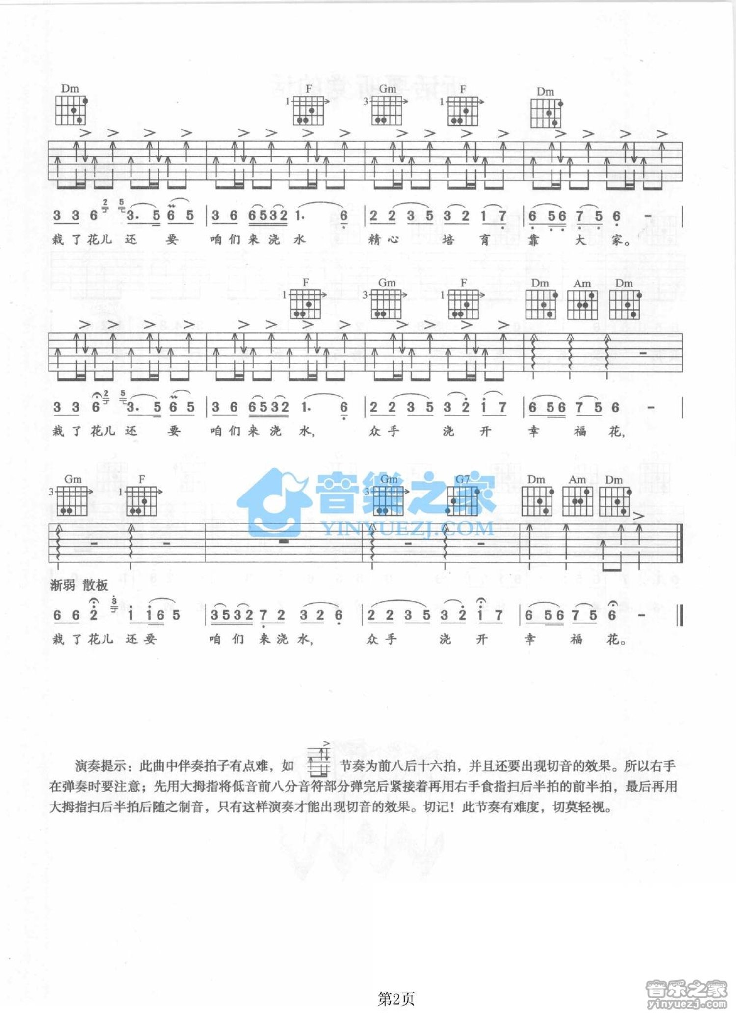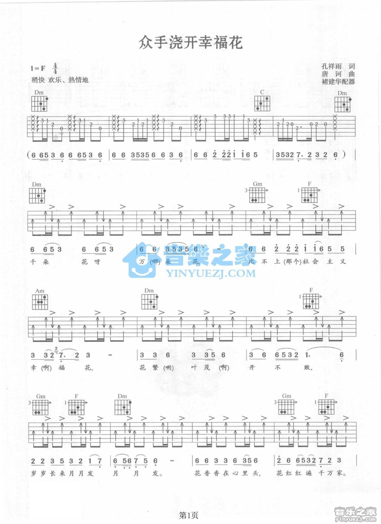 曲谱介绍: F调版经典老歌《众手浇开幸福花》吉他弹唱六线谱