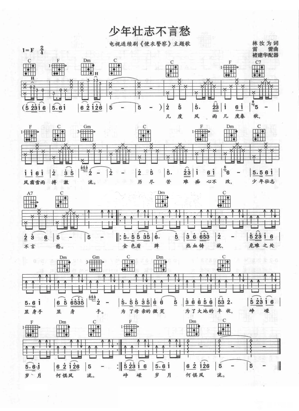 曲谱介绍: F调版刘欢《少年壮志不言愁》吉他弹唱六线谱