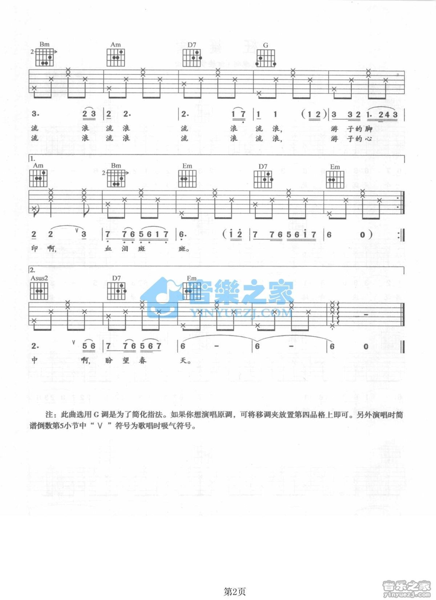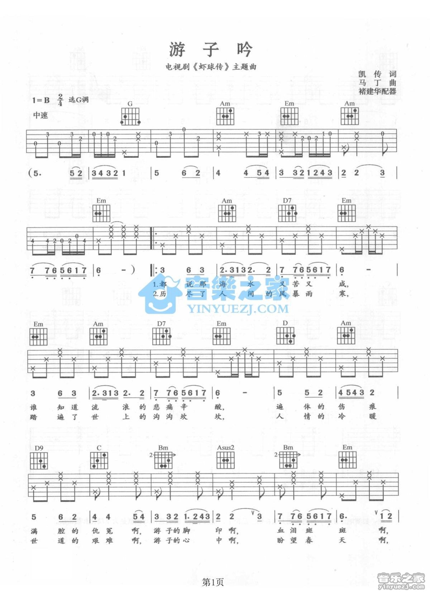 曲谱介绍: G调版《游子吟》吉他弹唱六线谱