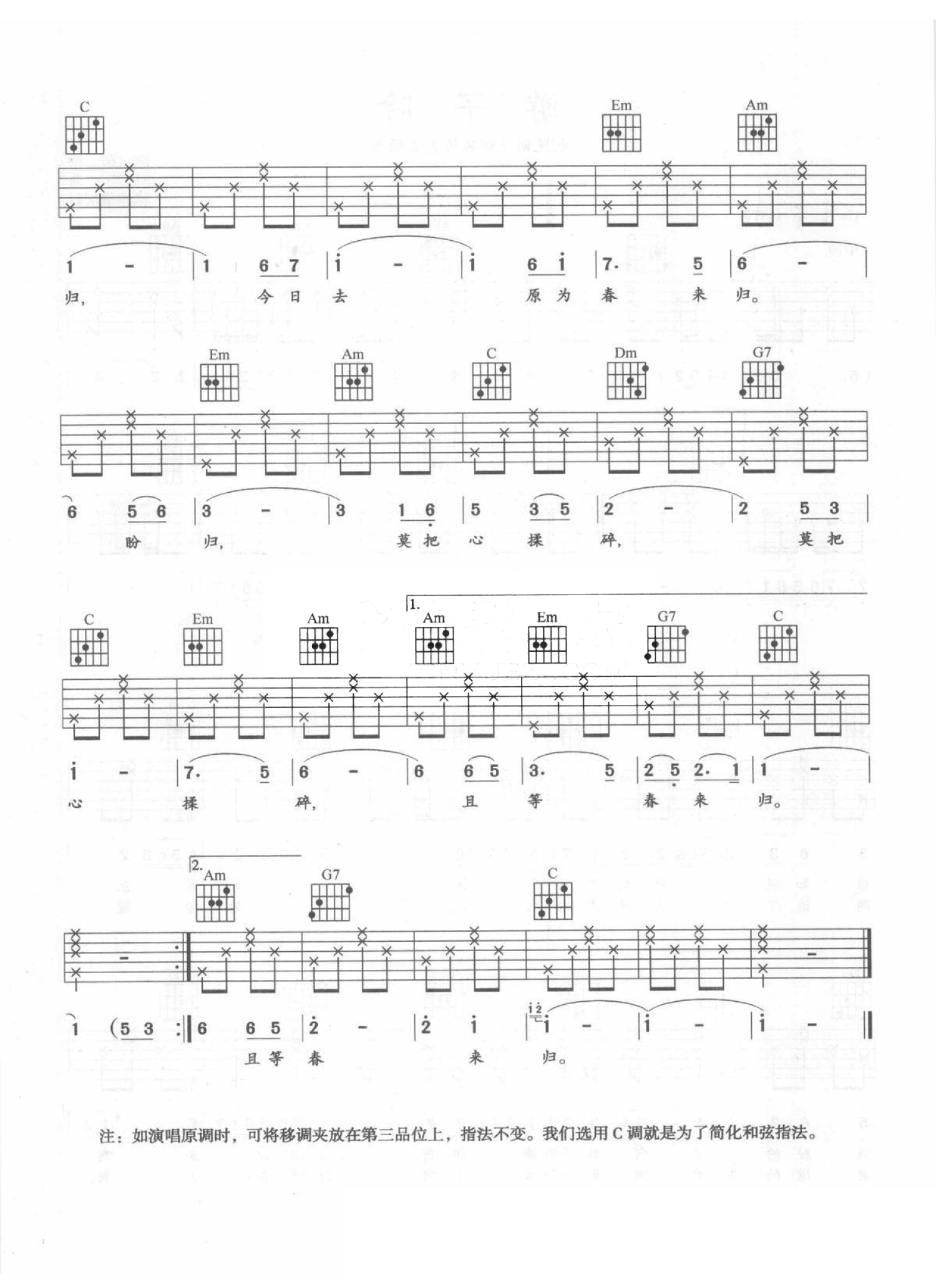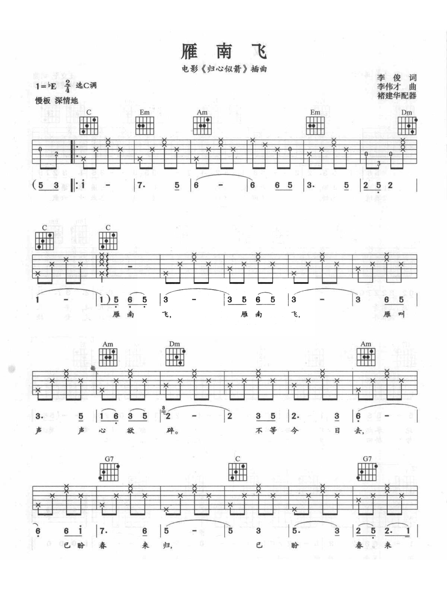 曲谱介绍: C调版《雁南飞》吉他弹唱六线谱