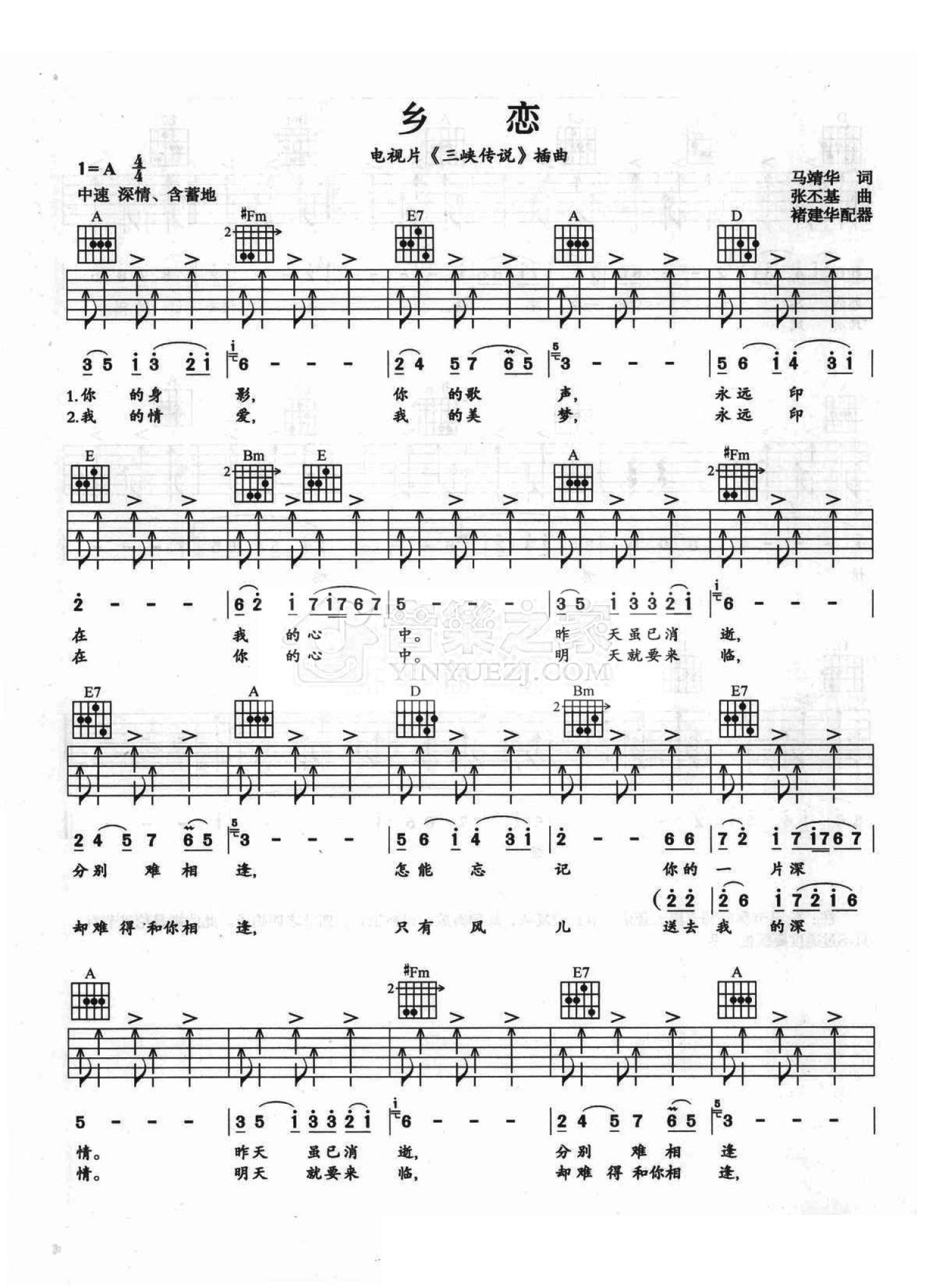 曲谱介绍: A调版李谷一《乡恋》吉他弹唱六线谱