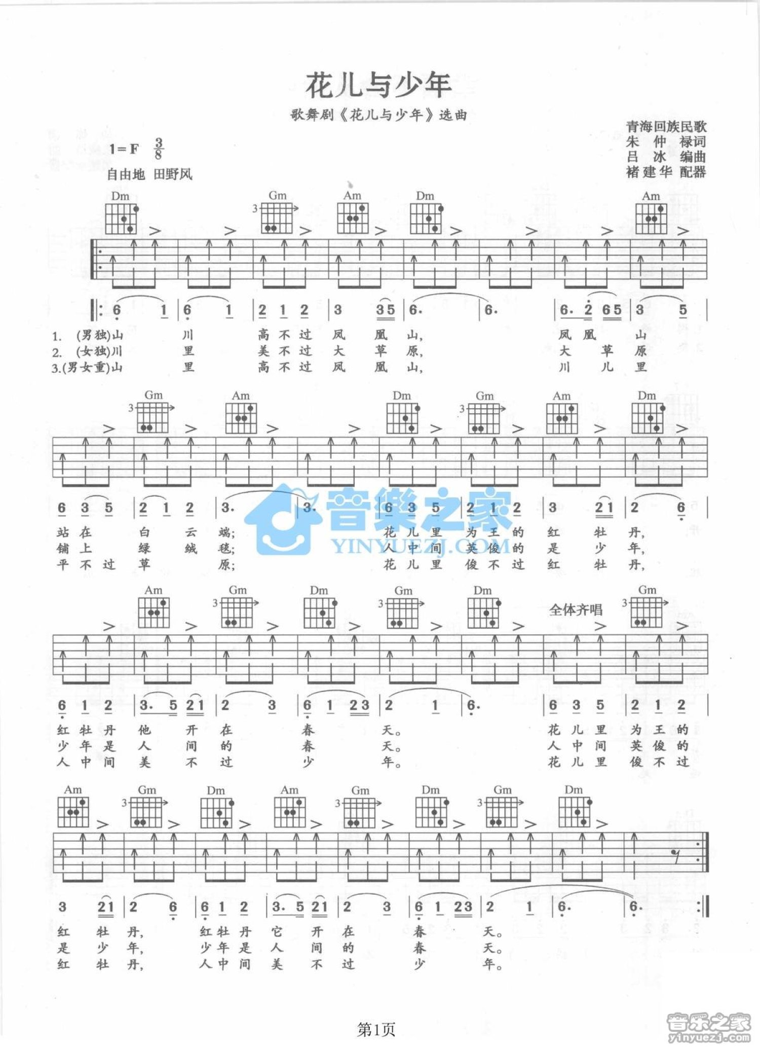 曲谱介绍: F调版回族民歌《花儿与少年》吉他弹唱六线谱